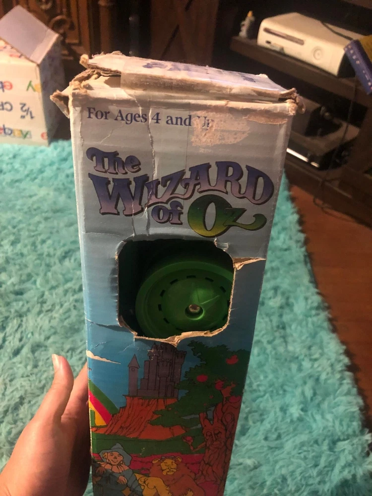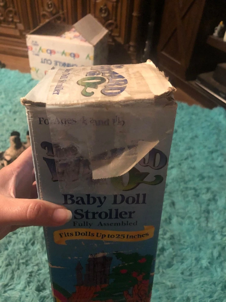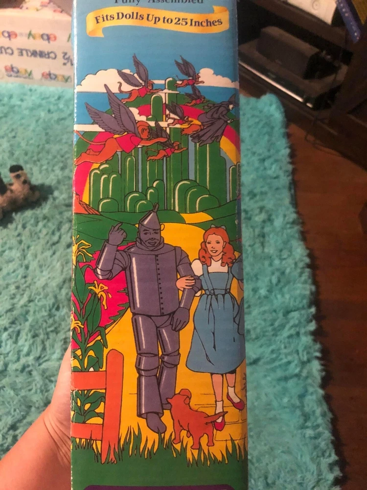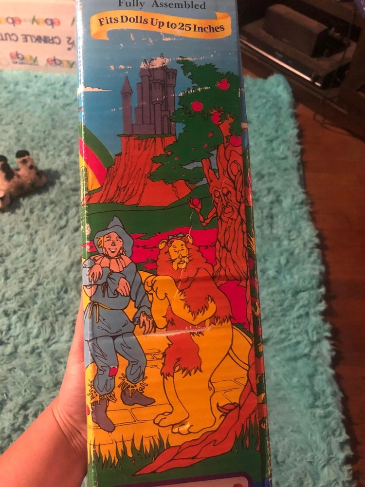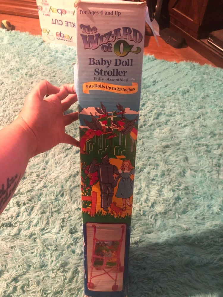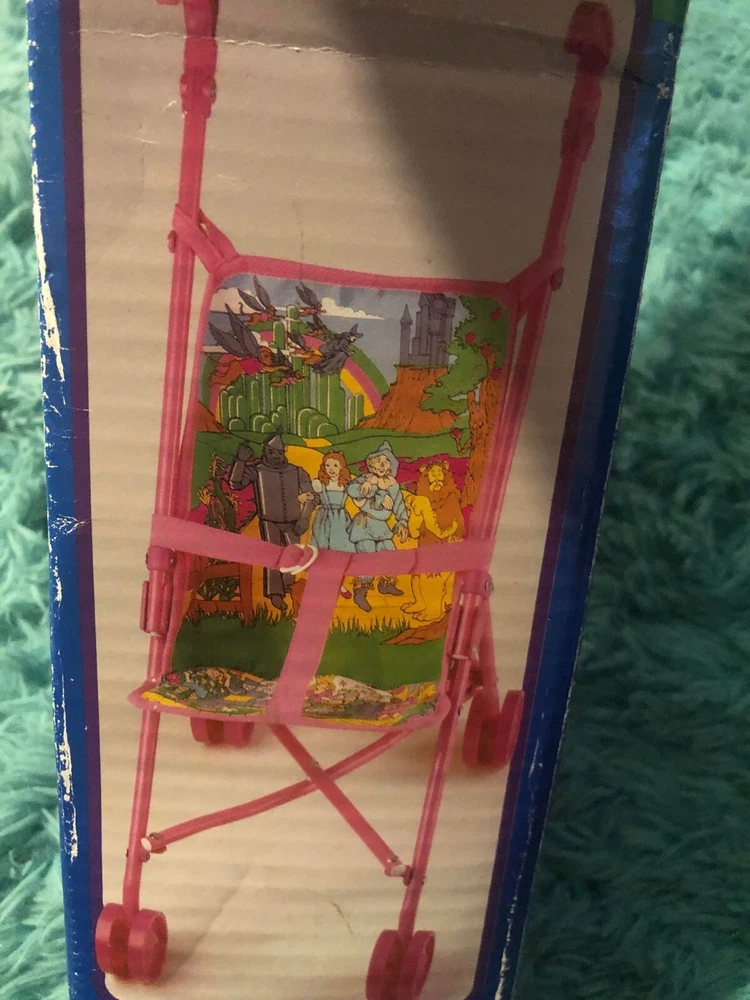 Hard to Find Wizard of Oz themed doll stroller. Fits dolls up to 25 inches. For ages 4 and up, fully assembled. The box shows the stroller as a pink one but it is actually green in color Box does have some damage. Top tape has come undone The box shows the stroller as a pink one but it is actually green in color as can be seen by the cut out in the box.