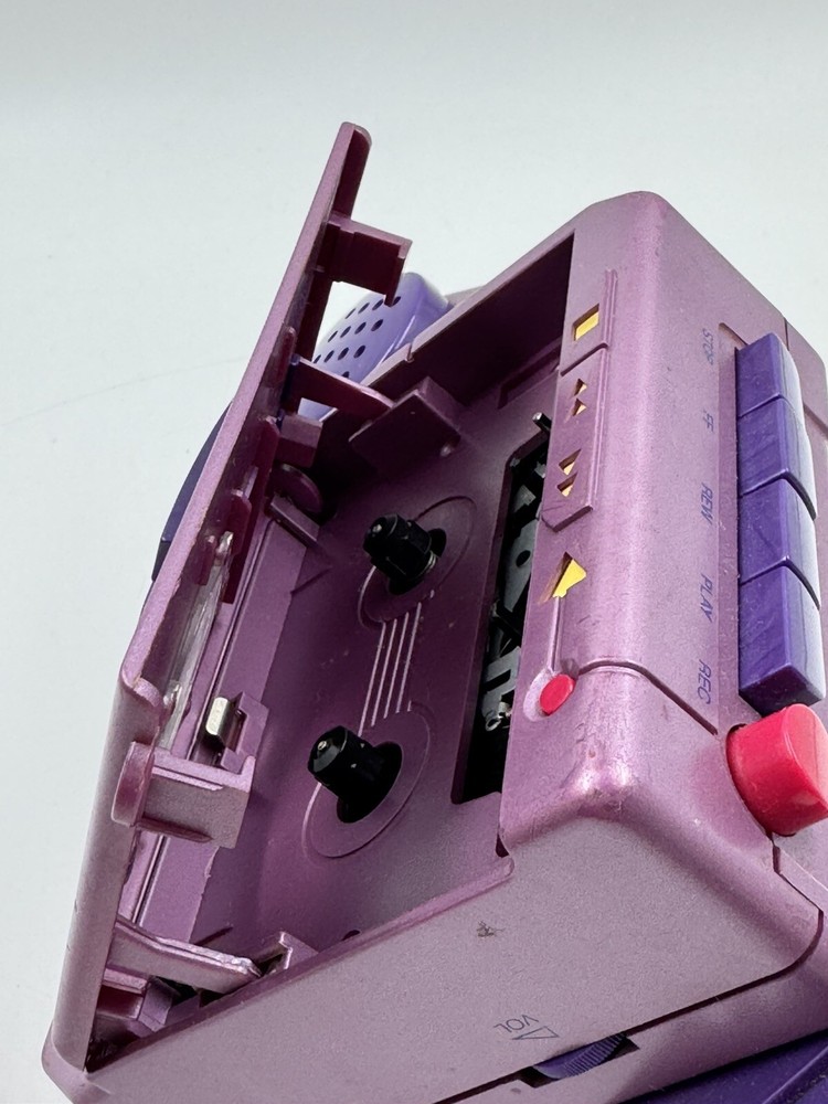 No tape to fully test. Tested with batteries. Ff & Rew function cause the pegs to spin. Sold as is. Missing battery cover. Has a few scratches and dings. Some textured damage(maybe from tape adhesive or sticker) on window to cassette