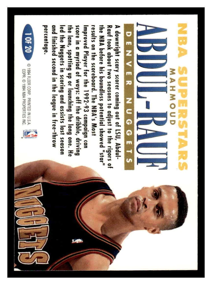 This is a nice example of a 1993-94 Fleer #1 Mahmoud Abdul-Rauf NBA Superstars Other important information about this card: In 1993 Mahmoud Abdul-Rauf played for the Denver Nuggets. Please check out our other listings for more great cards.