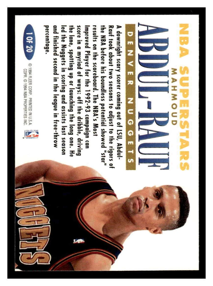 This is a nice example of a 1993-94 Fleer #1 Mahmoud Abdul-Rauf NBA Superstars Other important information about this card: In 1993 Mahmoud Abdul-Rauf played for the Denver Nuggets. Please check out our other listings for more great cards.