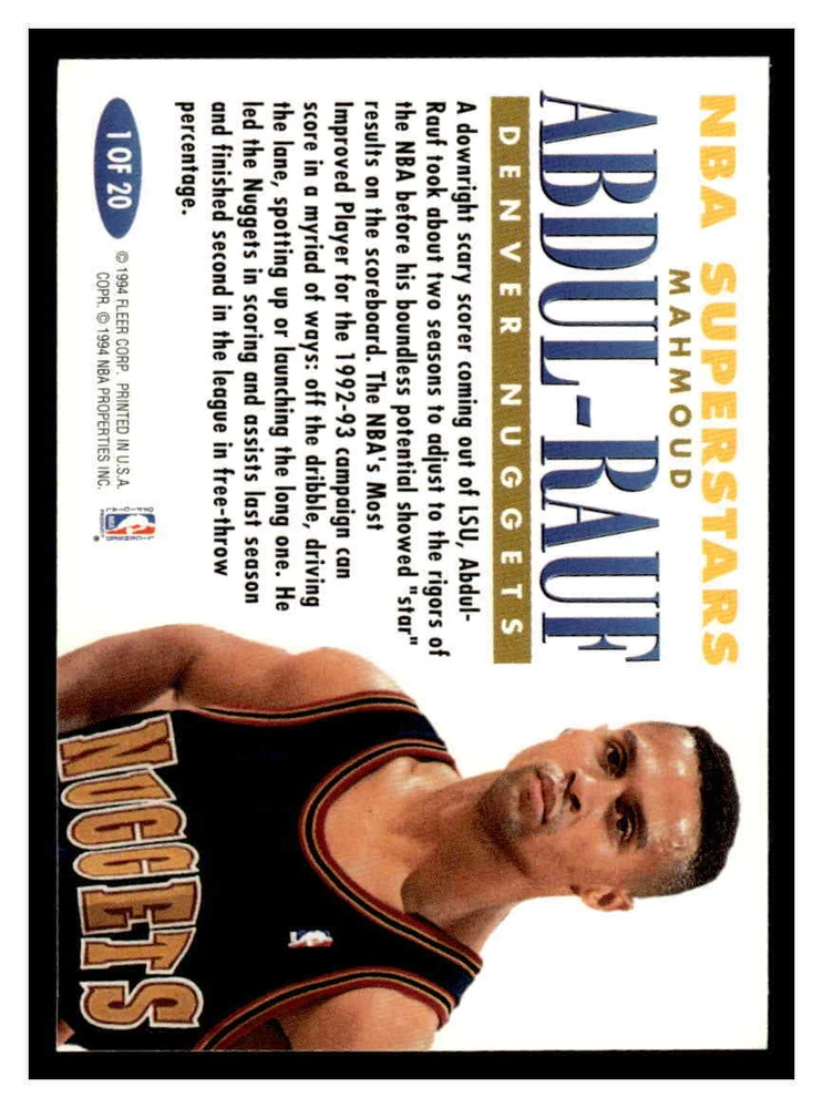 This is a nice example of a 1993-94 Fleer #1 Mahmoud Abdul-Rauf NBA Superstars Other important information about this card: In 1993 Mahmoud Abdul-Rauf played for the Denver Nuggets. Please check out our other listings for more great cards.