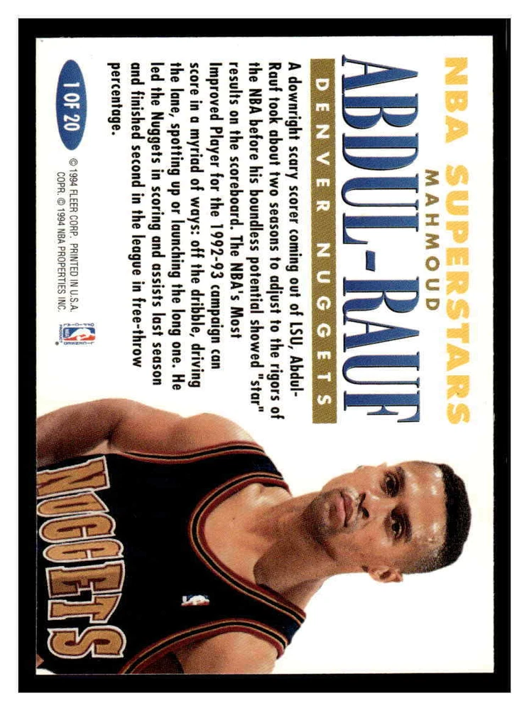 This is a nice example of a 1993-94 Fleer #1 Mahmoud Abdul-Rauf NBA Superstars Other important information about this card: In 1993 Mahmoud Abdul-Rauf played for the Denver Nuggets. Please check out our other listings for more great cards.