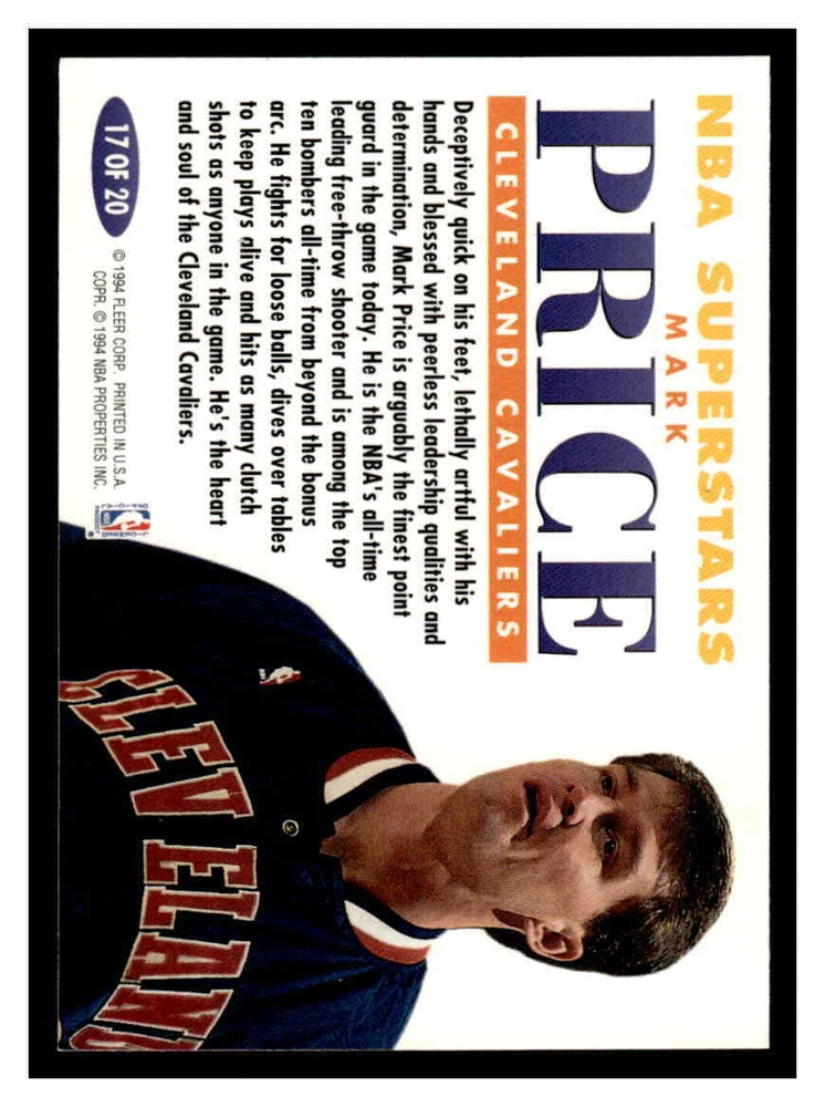 This is a nice example of a 1993-94 Fleer #17 Mark Price NBA Superstars Other important information about this card: In 1993 Mark Price played for the Cleveland Cavaliers. Please check out our other listings for more great cards.