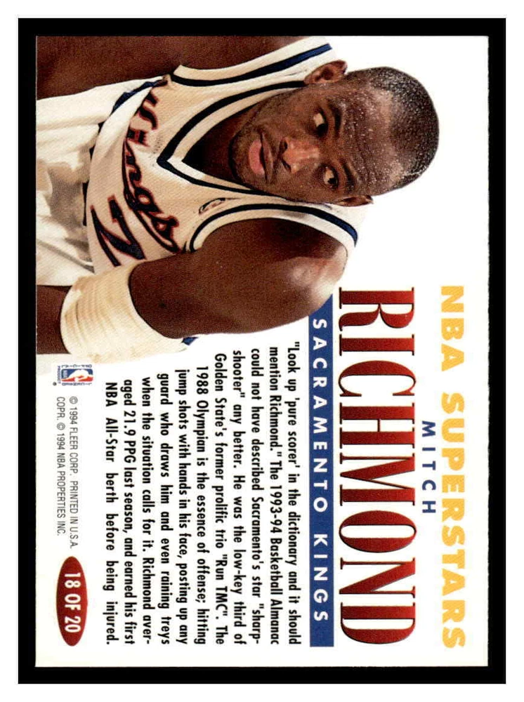 This is a nice example of a 1993-94 Fleer #18 Mitch Richmond NBA Superstars Other important information about this card: In 1993 Mitch Richmond played for the Sacramento Kings. Please check out our other listings for more great cards.