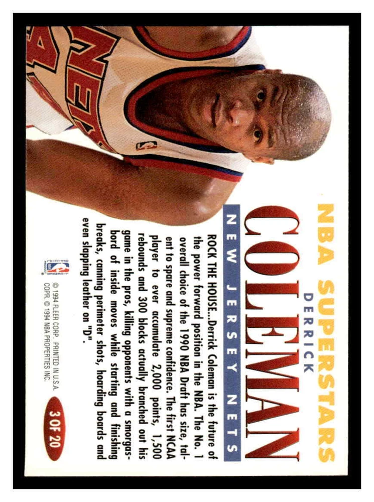Set: 1993-94 Fleer League: NBA Type: Sports Trading Card Autographed: No Season: 1993 Card Number: 3 Manufacturer: Fleer Graded: No Insert Set: NBA Superstars Year Manufactured: 1993 Sport: BASKETBALL Parallel/Variety: NBA Superstars Team: New Jersey Nets Player/Athlete: Derrick Coleman