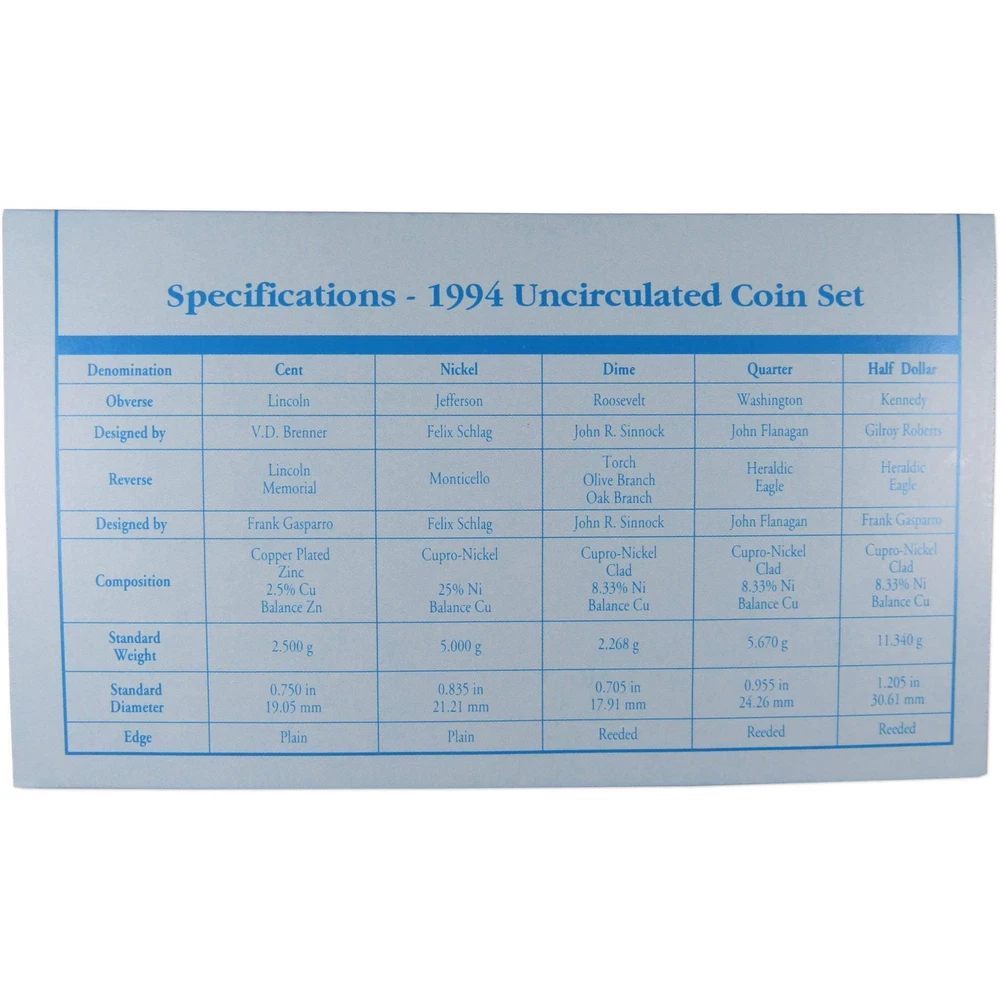 Home About Us Feedback View All Listings Contact Us Menu Home About Us Feedback View All Listings Contact Us 1994 Uncirculated Coin Set U.S Mint Original Government Packaging OGP This official 1994 U.S. Mint 10 coin Uncirculated Set contains Philadelphia and Denver Mint issues of the Kennedy half, Washington quarter, Roosevelt dime, Jefferson nickel & Lincoln cent. Comes with the original U.S. Mint packaging. Please note that Mint Sets prior to 2002 did not include a certificate of authenticity. These sets were made in 1994 and are not brand new. The packaging may show signs of wear such as minor folds and scrapes. The images used for this listing are stock photos from our inventory. Your purchase is guaranteed to match the quality of the product shown. Profile Coins & Collectibles - More Coins for the Money! Coin Type U.S. Mint Uncirculated Coin Set Denomination 1C, 5C, 10C, 25C, 50C Date 1994 Mint Mark P, D Grade Uncirculated Shop by category Coins: US Half Dollars Quarters Small Cents Dollars Dimes Nickels Three Cents Large Cents Two Cents Paper Money: US Store Newsletter Add our store to your Favorites to receive our email newsletters about new items & special promotions. Sign Up Home About Us Feedback View All Listings Contact Us Copyright © 2019 Profile Coins & Collectibles. All rights reserved. eBay template Design by OCDesignsOnline