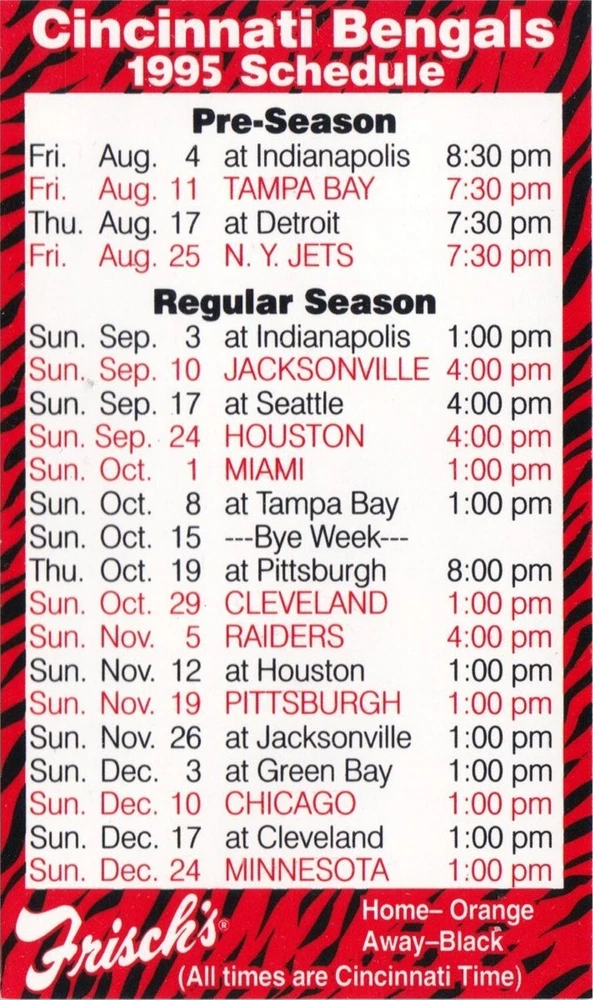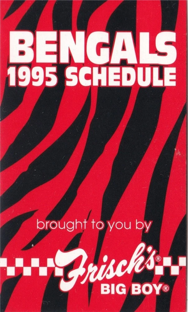 1995 Cincinnati Bengals NFL Football Pocket Schedule- Frischs - See picture for condition. I’m a collector just trying to clear out space. All Items are used unless stated otherwise. I try and list any major flaws I see. Please check out my other lots. Shipping discounts on multiple auctions won!! Please email at close of auction for combined shipping. Ebay will not automaticly combine postage. We only ship to the US. Please pay or contact us within 7 days of closing or we have to report it as a nonpay to ebay. Check out my other auctions on Ebay. Thanks for looking!! Our items do NOT come from a smoke-free environment. Please be aware of this before you place a bid. We get our items from many different sources and they have probably been exposed to smoke - cigarette, cigar, pipe or other - or pets, so if these issues are likely to bother you, please reconsider bidding. I make every effort to accurately and honestly describe each item. Most items are vintage/pre-owned and are sold as such. The flaws I see are listed. Our items are sent to you clean but odors may still linger. My goal is that you, as a buyer, are happy with your purchase