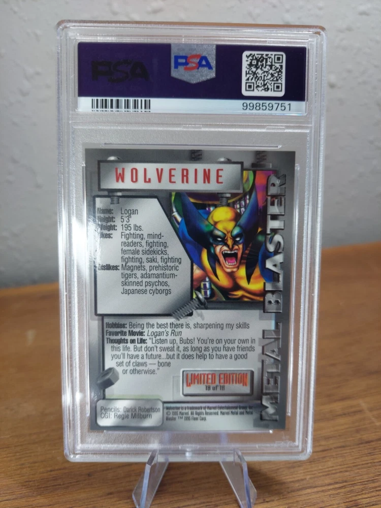 Up for sale is a rare and highly sought-after 1995 Marvel Metal Blaster Wolverine Limited Edition #18 PSA 9 trading card. This card features the iconic Marvel character Wolverine and is part of the Marvel Metal set manufactured by Fleer. The card is made of high-quality card stock and has a standard size. This non-sport trading card is an original and licensed reprint from the Marvel (MCU) franchise. It is perfect for collectors of comics and X-Men TV show memorabilia. The card is in excellent condition and is a great addition to any collection. Don't miss your chance to own this limited edition Marvel Metal Blaster Wolverine trading card.