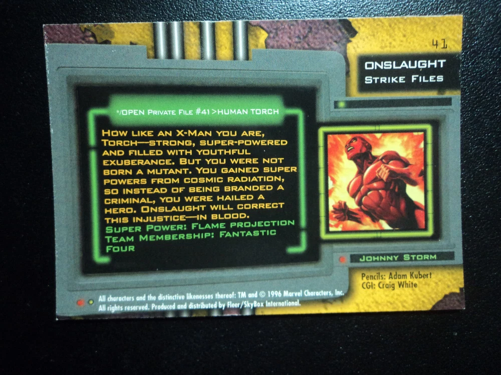 PLEASE DO NOT PAY FOR MULTIPLE PURCHASES SEPARATELY ! _____________________________________________________________________________ Here's what you get: Marvel Ultra Onslaught - Fleer/SkyBox International - 1996 Base Card No. Title Artists 41 Human Torch Adam Kubert, Craig White NOTE: CARD MAY SHOW A MINOR DEGREE OF " BRICKING " - SEE PHOTOS. YOU WILL RECEIVE THE CARD IN THE PHOTOS. YOU WILL RECEIVE THE CARD IN THE PHOTOS. _____________________________________________________________________________ Card stored in a smoke-free home. Payment due within 48 hours of purchase. NOTE: IF PURCHASING FROM MORE THEN ONE LISTING, PLEASE DO NOT PAY FOR THEM SEPARATELY, RATHER REQUEST AN INVOICE FROM ME, OR AWAIT RECEIPT OF AN INVOICE FROM ME BEFORE PAYING. When possible, I will combine shipping and handling. A tracking number will be provided on all First Class and Priority packages. You must have a confirmed eBay mailing address. My goal is to provide excellent service to buyers, so I may earn your business over and over. Any questions, please feel free to e-mail me. Please check out my other listings. Happy Collecting. _____________________________________________________________________________