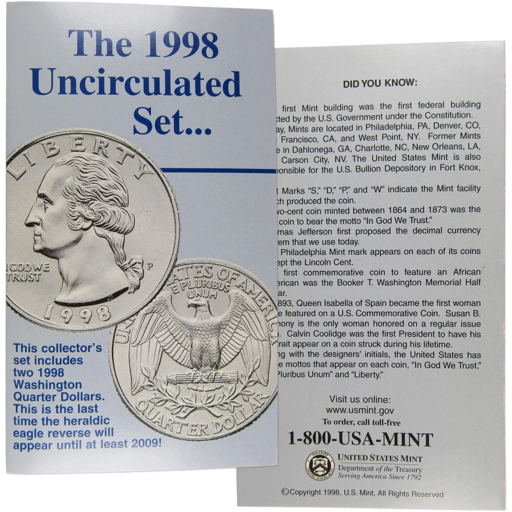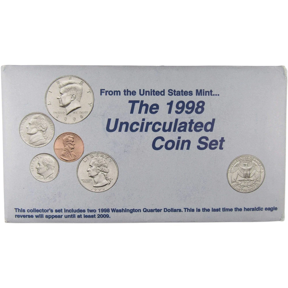 Home About Us Feedback View All Listings Contact Us Menu Home About Us Feedback View All Listings Contact Us 1998 Uncirculated Coin Set U.S Mint Original Government Packaging OGP This official 1998 U.S. Mint 10 coin Uncirculated Set contains Philadelphia and Denver Mint issues of the Kennedy half, Washington quarter, Roosevelt dime, Jefferson nickel & Lincoln cent. Comes with the original U.S. Mint packaging. Please note that Mint Sets prior to 2002 did not include a certificate of authenticity. These sets were made in 1998 and are not brand new. The packaging may show signs of wear such as minor folds and scrapes. The images used for this listing are stock photos from our inventory. Your purchase is guaranteed to match the quality of the product shown. Profile Coins & Collectibles - More Coins for the Money! Coin Type U.S. Mint Uncirculated Coin Set Denomination 1C, 5C, 10C, 25C, 50C Date 1998 Mint Mark P, D Grade Uncirculated Shop by category Coins: US Half Dollars Quarters Small Cents Dollars Dimes Nickels Three Cents Large Cents Two Cents Paper Money: US Store Newsletter Add our store to your Favorites to receive our email newsletters about new items & special promotions. Sign Up Home About Us Feedback View All Listings Contact Us Copyright © 2019 Profile Coins & Collectibles. All rights reserved. eBay template Design by OCDesignsOnline