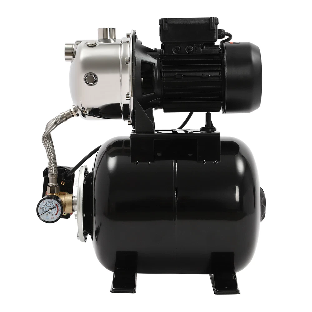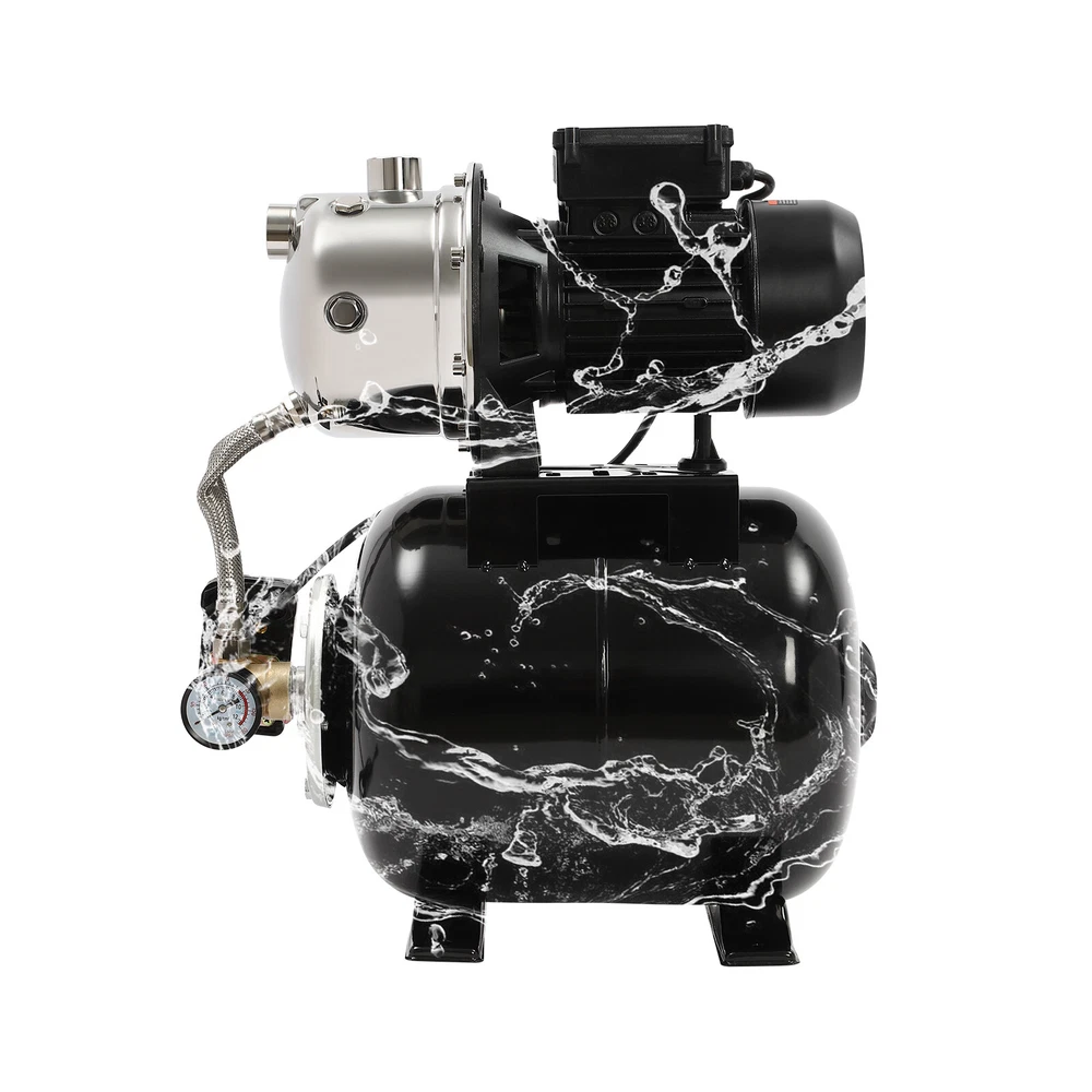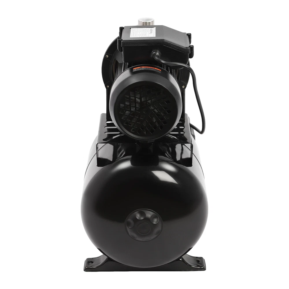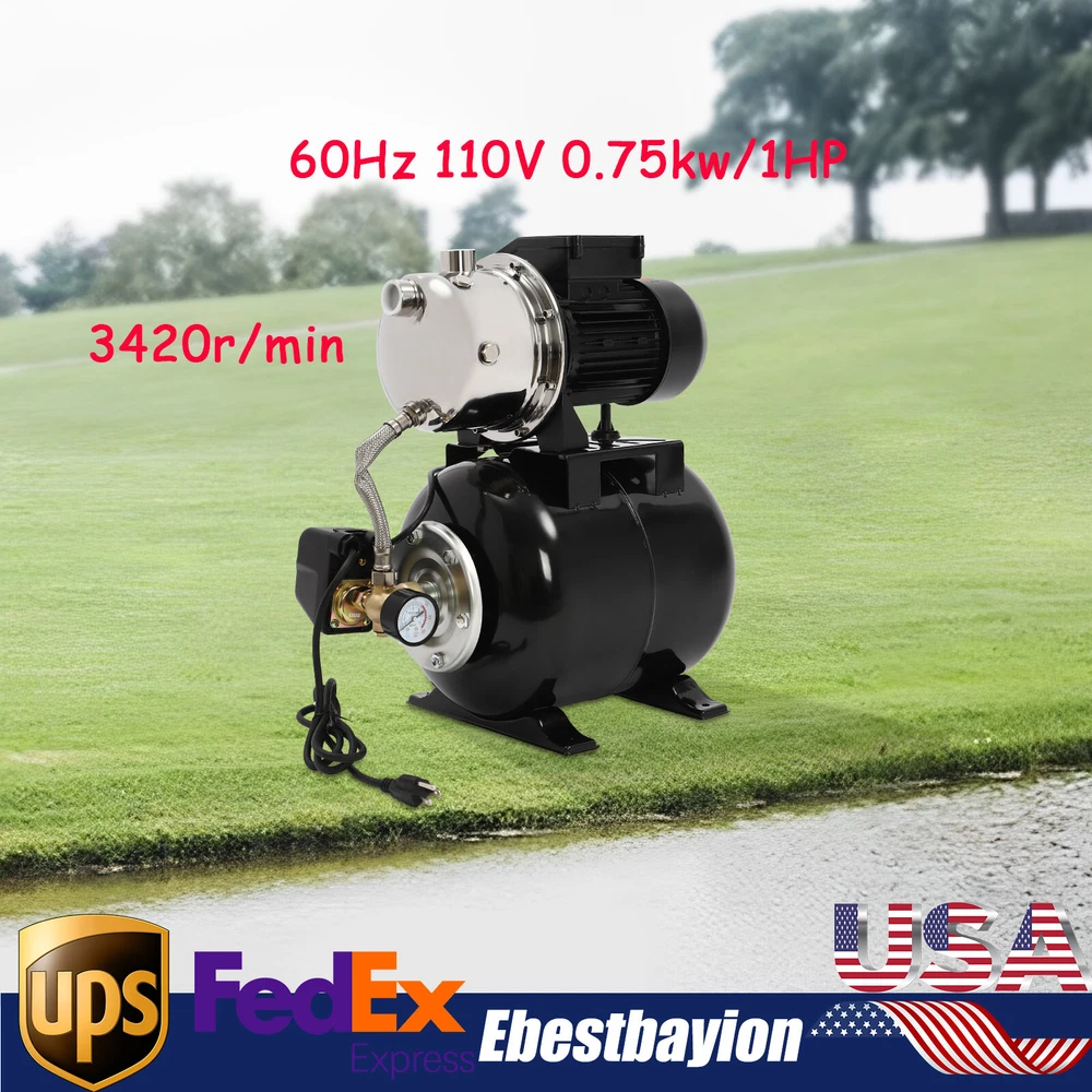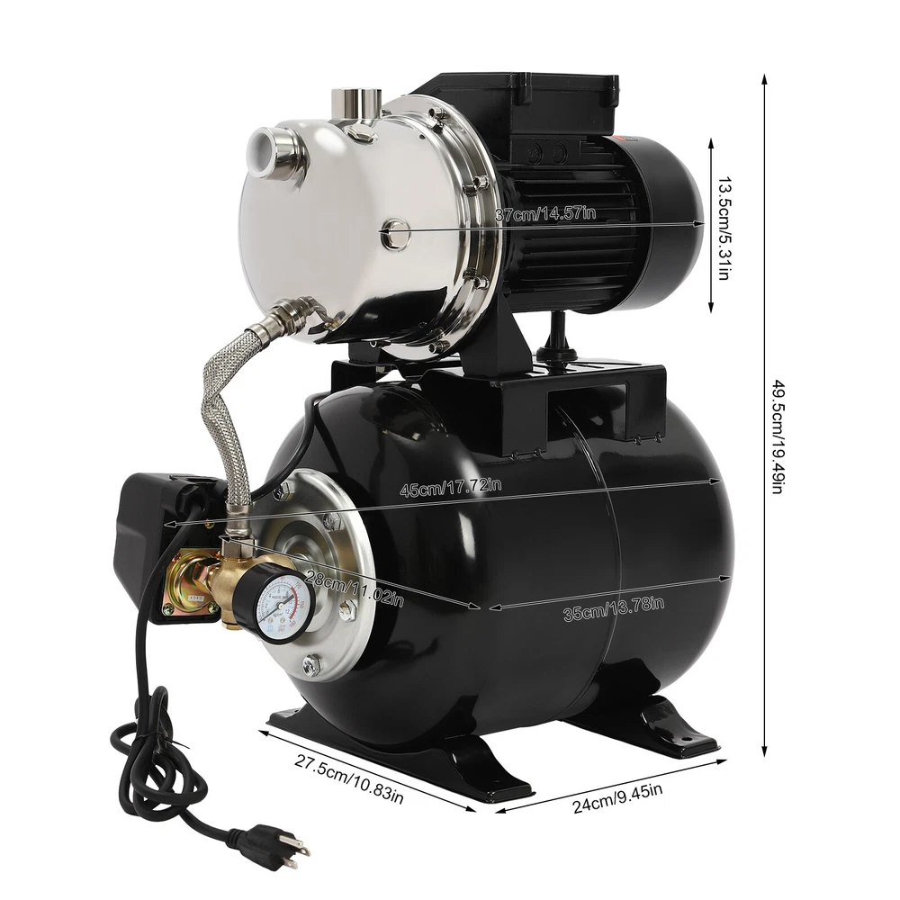 Details IP44 Protection Level: It can prevent dust and rain from accumulating to a certain extent, and prevent rain or water from splashing into the interior of the equipment, thus prolonging the service life of the product. Support Base: With pre-drilled holes on the base, you can secure this product on the ground with screws for better stability during operation. Application The product is suitable for long-distance water transportation, garden irrigation, farm irrigation, lawn sprinkler irrigation, high-rise living water, faucet and shower pressurization, groundwater and well water extraction, water supply, and so on. Package Included 1* Shallow Well Pump 1* PTFE Tape 1* Multi-language Manual 1HP Irrigation Water Pump Shallow Well Pump with Pressure Tank 3420r/min 0.75kw Description Built with high-quality materials, this shallow well water pump with a powerful pure copper motor and a 6.34-gallon pressure tank is durable and efficient, making it an ideal tool for your home tap water boosting, agricultural or gardening pumping, and irrigation work. The automatic pressure switch and self-priming system make the operation of the product easier and smarter, making your life more comfortable and your work more efficient. Key Features Build to Last : With a high-quality stainless steel pump head, cast aluminum pump casing, and the paint spraying process, the product is sturdy, resistant to rust, corrosion, and deformation, and can keep practicality for a long time. High Efficiency : It is powered by a 1HP motor that can spin up to 3420rpm, giving the product a maximum flow rate of 105.94 ft³/hour, which provides the power to pump water faster and easier. High Pumping Head: With a maximum head of 147.64 feet, the pump has a wide range of irrigation distances and acreages, which can significantly save the time and cost of manual transportation. Thoughtful Design: The 6.34gal pressure tank and automatic pressure switch allow the product to automatically start at 20psi and shut off at 40psi. In addition, the clear pressure gauge allows you to easily observe and promptly make adjustments. Safety Guarantee: The product has overload, overheating, and water shortage protection, which will make the product automatically stop working and cut off the power to ensure the safety of use. Excellent Sealing Performance: The product is equipped with a durable carbon ceramic mechanical seal and PTFE tape to prevent leakage and extend product life. Quick Heat Dissipation : The powerful fan and heat emission holes give the product excellent heat dissipation performance to prevent the product from overburning. Customer Service: We aim to provide quality products and services. If you have any problems, please feel free to contact us. We will reply and solve the problem for you as soon as possible. Details IP44 Protection Level: It can prevent dust and rain from accumulating to a certain extent, and prevent rain or water from splashing into the interior of the equipment, thus prolonging the service life of the product. Support Base: With pre-drilled holes on the base, you can secure this product on the ground with screws for better stability during operation. Application The product is suitable for long-distance water transportation, garden irrigation, farm irrigation, lawn sprinkler irrigation, high-rise living water, faucet and shower pressurization, groundwater and well water extraction, water supply, and so on. Specifications Color: Black Style: Modern Process: Spray Paint Material: Stainless Steel, Cast Aluminum, Ceramic Copper Type: Pure Copper Brushless Motor Plug Type: US Standard Flow Rate: 3m³/105.94ft³/h Max. Head: 45m/147.64ft Power: 0.75kw/1HP Speed: 3420r/min Input Current: 7A Frequency: 60Hz Voltage: 110V Capacitance Capacity: 35μF Protection Level: IP44 Insulation Grade: B Water Inlet Size: 2.54cm/1in Water Outlet Size: 2.54cm/1in Power Cord Length: 1m/3.28ft Tank Capacity: 24L/6.34Gal/25.36qt Suitable Water Temperature: 0-75℃/32-167℉ Phase: 1~Mot Noise: 0-30dB Thread Type: G Suitable Well Depth: 8-25m/26.25-82ft Product Overall Size: 45*27.5*49.5cm/17.72*10.83*19.49in Tank Size(D*H): 28*35cm/11.02*13.78in Motor Size(D*H): 13.5*37cm/5.31*14.57in Base Size: 24*27.5cm/9.45*10.83in Packaging Size: 50*35*58cm/19.69*13.78*22.83in Gross Weight: 13.2kg/29.1lbs Package Included 1* Shallow Well Pump 1* PTFE Tape 1* Multi-language Manual Notes Please check the size carefully before ordering. Please read the manual carefully before operating the pump. Please do not run the pump without water. Please be sure that the pump is properly grounded before operating. Please allow the slight color difference caused by the shooting light and 1-3cm error due to manual measurement, and make sure you do not mind before you order. Payment Delivery details Terms of sales About us Contact us Payment We accept ebay payment 。 Fees such as import duties, taxes are not included in the item price or shipping costs. These charges are the buyer's responsibility. Delivery details Shipping: 2-9 working days to: USA Terms of sales We maintain high standards of excellence and strive for hundred percent customer satisfaction. Feedback is very important to us. We hope that you contact us immediately before you give neutral or negative feedback, so that we can address your concerns. It is impossible to address issues if we do not know about them! About us Your satis faction is our ultimate goal. We work hard to earn your trust and future business. Our certified technicians have tested each item before shipping. The unit comes with 1 year limited warranty on all manufacturing defects. a) If you receive a defective item, you may return it or ask for a discount. Please contact us within 14 days after you receive the package. b) What you returned must be intact and in its original packaging as re? u. Customer is responsible for shipping costs of the returned item. c) We will cover the cost of shipping back t with the shipping rate 
