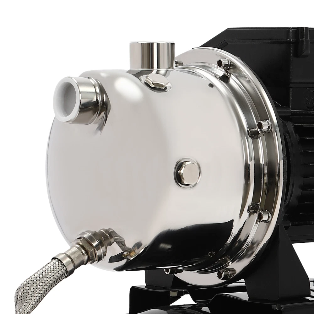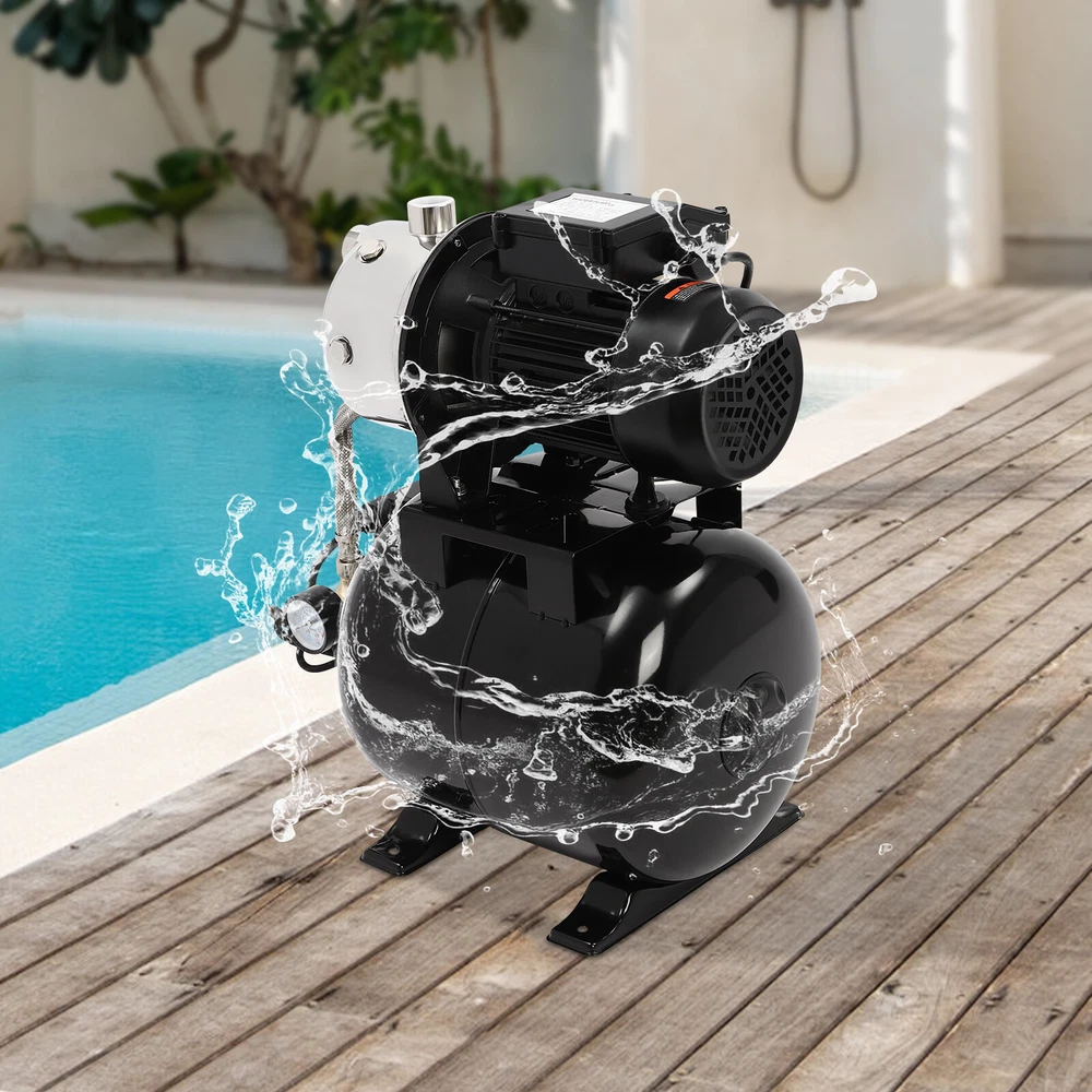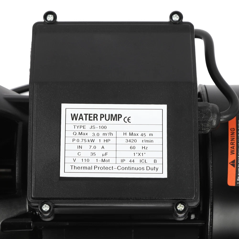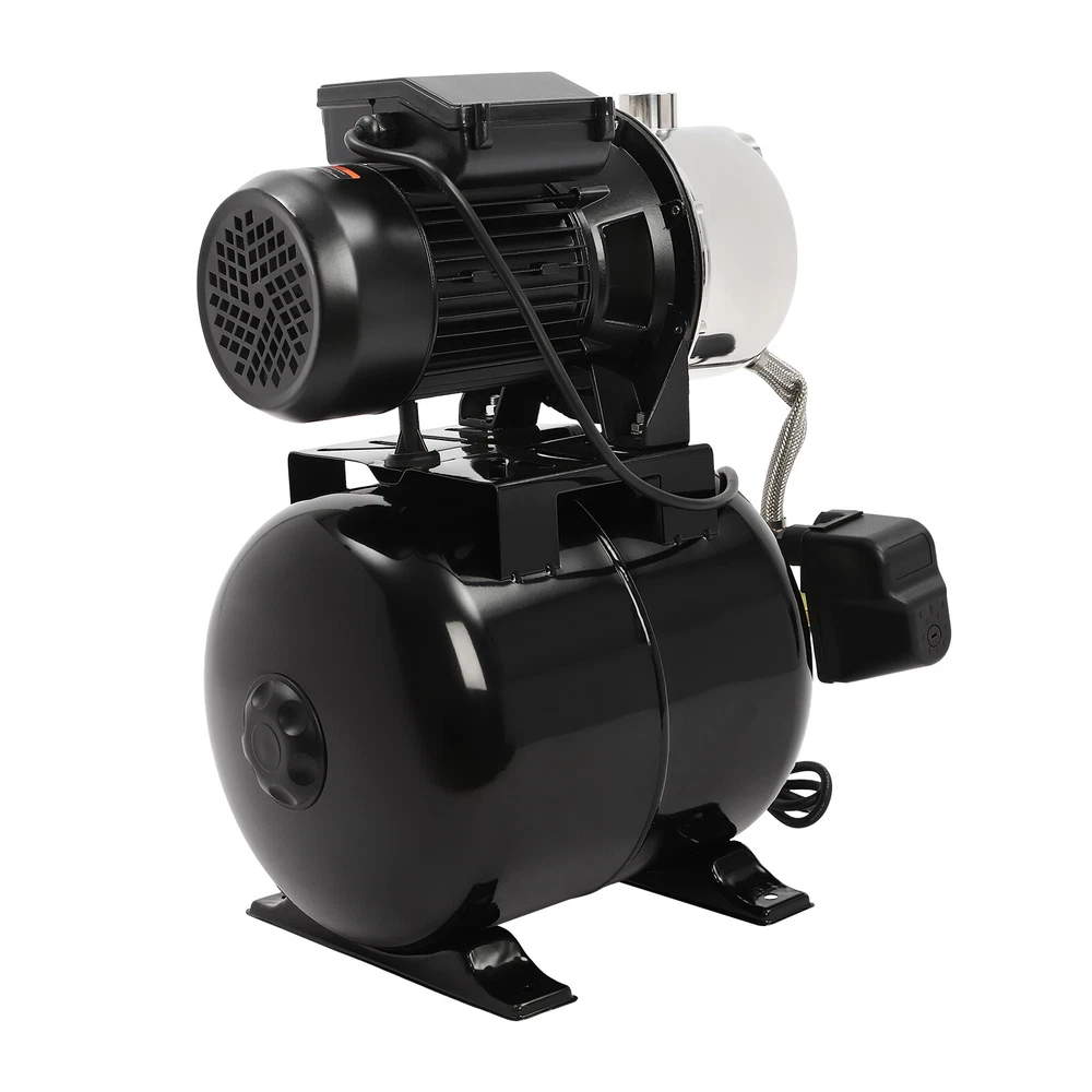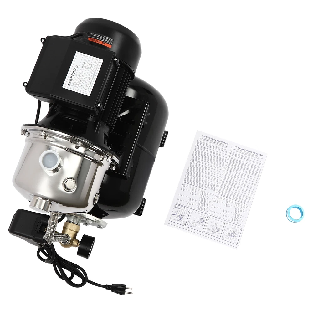 Details IP44 Protection Level: It can prevent dust and rain from accumulating to a certain extent, and prevent rain or water from splashing into the interior of the equipment, thus prolonging the service life of the product. Support Base: With pre-drilled holes on the base, you can secure this product on the ground with screws for better stability during operation. Application The product is suitable for long-distance water transportation, garden irrigation, farm irrigation, lawn sprinkler irrigation, high-rise living water, faucet and shower pressurization, groundwater and well water extraction, water supply, and so on. Package Included 1* Shallow Well Pump 1* PTFE Tape 1* Multi-language Manual 1HP Irrigation Water Pump Shallow Well Pump with Pressure Tank 3420r/min 0.75kw Description Built with high-quality materials, this shallow well water pump with a powerful pure copper motor and a 6.34-gallon pressure tank is durable and efficient, making it an ideal tool for your home tap water boosting, agricultural or gardening pumping, and irrigation work. The automatic pressure switch and self-priming system make the operation of the product easier and smarter, making your life more comfortable and your work more efficient. Key Features Build to Last : With a high-quality stainless steel pump head, cast aluminum pump casing, and the paint spraying process, the product is sturdy, resistant to rust, corrosion, and deformation, and can keep practicality for a long time. High Efficiency : It is powered by a 1HP motor that can spin up to 3420rpm, giving the product a maximum flow rate of 105.94 ft³/hour, which provides the power to pump water faster and easier. High Pumping Head: With a maximum head of 147.64 feet, the pump has a wide range of irrigation distances and acreages, which can significantly save the time and cost of manual transportation. Thoughtful Design: The 6.34gal pressure tank and automatic pressure switch allow the product to automatically start at 20psi and shut off at 40psi. In addition, the clear pressure gauge allows you to easily observe and promptly make adjustments. Safety Guarantee: The product has overload, overheating, and water shortage protection, which will make the product automatically stop working and cut off the power to ensure the safety of use. Excellent Sealing Performance: The product is equipped with a durable carbon ceramic mechanical seal and PTFE tape to prevent leakage and extend product life. Quick Heat Dissipation : The powerful fan and heat emission holes give the product excellent heat dissipation performance to prevent the product from overburning. Customer Service: We aim to provide quality products and services. If you have any problems, please feel free to contact us. We will reply and solve the problem for you as soon as possible. Details IP44 Protection Level: It can prevent dust and rain from accumulating to a certain extent, and prevent rain or water from splashing into the interior of the equipment, thus prolonging the service life of the product. Support Base: With pre-drilled holes on the base, you can secure this product on the ground with screws for better stability during operation. Application The product is suitable for long-distance water transportation, garden irrigation, farm irrigation, lawn sprinkler irrigation, high-rise living water, faucet and shower pressurization, groundwater and well water extraction, water supply, and so on. Specifications Color: Black Style: Modern Process: Spray Paint Material: Stainless Steel, Cast Aluminum, Ceramic Copper Type: Pure Copper Brushless Motor Plug Type: US Standard Flow Rate: 3m³/105.94ft³/h Max. Head: 45m/147.64ft Power: 0.75kw/1HP Speed: 3420r/min Input Current: 7A Frequency: 60Hz Voltage: 110V Capacitance Capacity: 35μF Protection Level: IP44 Insulation Grade: B Water Inlet Size: 2.54cm/1in Water Outlet Size: 2.54cm/1in Power Cord Length: 1m/3.28ft Tank Capacity: 24L/6.34Gal/25.36qt Suitable Water Temperature: 0-75℃/32-167℉ Phase: 1~Mot Noise: 0-30dB Thread Type: G Suitable Well Depth: 8-25m/26.25-82ft Product Overall Size: 45*27.5*49.5cm/17.72*10.83*19.49in Tank Size(D*H): 28*35cm/11.02*13.78in Motor Size(D*H): 13.5*37cm/5.31*14.57in Base Size: 24*27.5cm/9.45*10.83in Packaging Size: 50*35*58cm/19.69*13.78*22.83in Gross Weight: 13.2kg/29.1lbs Package Included 1* Shallow Well Pump 1* PTFE Tape 1* Multi-language Manual Notes Please check the size carefully before ordering. Please read the manual carefully before operating the pump. Please do not run the pump without water. Please be sure that the pump is properly grounded before operating. Please allow the slight color difference caused by the shooting light and 1-3cm error due to manual measurement, and make sure you do not mind before you order. Payment Delivery details Terms of sales About us Contact us Payment We accept ebay payment 。 Fees such as import duties, taxes are not included in the item price or shipping costs. These charges are the buyer's responsibility. Delivery details Shipping: 2-9 working days to: USA Terms of sales We maintain high standards of excellence and strive for hundred percent customer satisfaction. Feedback is very important to us. We hope that you contact us immediately before you give neutral or negative feedback, so that we can address your concerns. It is impossible to address issues if we do not know about them! About us Your satis faction is our ultimate goal. We work hard to earn your trust and future business. Our certified technicians have tested each item before shipping. The unit comes with 1 year limited warranty on all manufacturing defects. a) If you receive a defective item, you may return it or ask for a discount. Please contact us within 14 days after you receive the package. b) What you returned must be intact and in its original packaging as re? u. Customer is responsible for shipping costs of the returned item. c) We will cover the cost of shipping back t with the shipping rate 