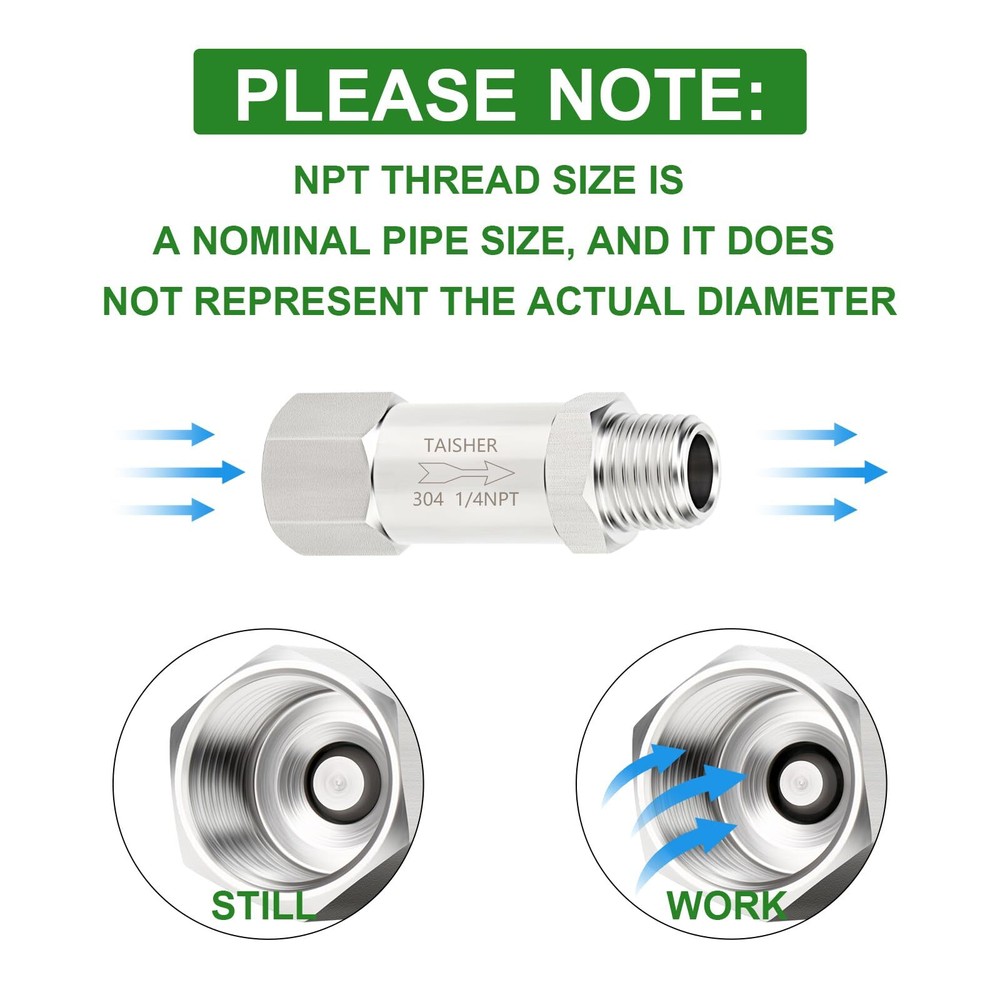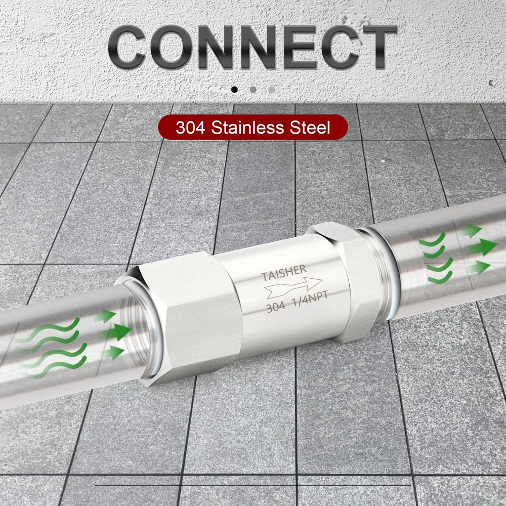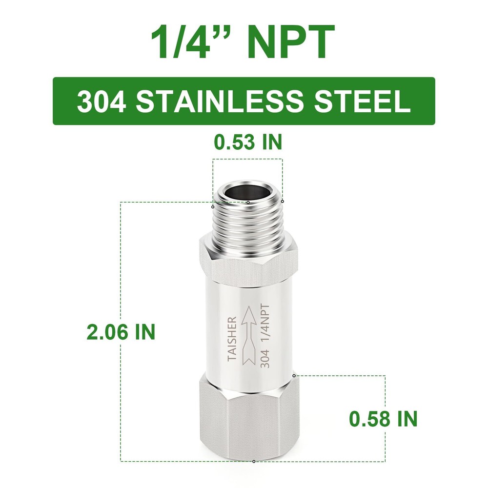 [ Product Type ] Check Valve(1/4" NPT Male x 1/4" NPT Female) ,for industry connecting pipes or fittings with different end types, diameters, or materials. [ Metal ] 304 stainless steel strength and resistance to corrosion. [ Working Temperature& Maximum Pressure ] Temperature range from -60 to 450 degrees F.Maximum working pressure is 600PSI. [ Introduction ] Used to prevent fluid backflow, good tightness, no leakage, easy to install and disassemble. [ Applications ] Widely used in fuel/air/liquid/oil/gas, pipeline applications and connections, and can be used in various measuring devices and collectors.