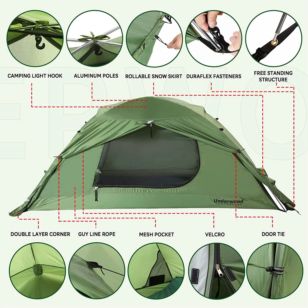 FOUR SEASON TENT: While other 3 season tents are only available for spring, summer and fall, this extreme weather tent is suitable for all seasons of the year. In winter, the snow skirt of this 1 person backpacking tent makes sure that it can keep snow away. The roll-able design makes it convenient when there is no snow around. In other seasons, the mesh design of the 4 season backpacking tent keeps bugs away while the double-layer door ensures ventilation SMART DESIGN: Two-way zipper is a little trick of using the ultralight backpacking tent at ease. The interior of the hiking tent has a camping light hook to hang a lantern and a mesh pocket to store your camping accessories or cell phone. Double layered corner can withstand high winds and powerful storms. That makes it a heavy duty tent. This single person tent is a good choice for outdoor activities. Moreover, this winter camping tent pairs well with the camping mattress in the store SINGLE PERSON TENT: This lightweight backpacking tent is designed for single person, a good choice when you want to have some private space. With a center height of 35.8’’ and a floor size of 31.8’’ X 86.6’’, its packed size is 5.1’’ X 15’’, weighing just 4 pounds. This outdoor camping tent is super compact, lightweight and easy to store. The free standing structure can keep this small camping tent together with aluminium poles and the duraflex fasteners connect the tent and the rain fly UPGRADED MATERIALS: The backpack tent is designed with high quality materials to be used in all weather of the year. Includes durable aircraft grade aluminum poles and full cover rain fly for winter temperatures. The aluminum poles of the waterproof tent feature light and tough. The rain fly design and PU5000mm coating of the cold weather tent make sure the interior dry and clean. All these make the small camping tent windproof and waterproof 100% : The Underwood Aggregator winter tent undergoes rigid inspection before its departure from the factory. Should you have any problems with the 1 man tent, please feel free to reach out to us. We are ready to help and happy to hear from you. Your satisfaction, our responsibility BRAND STORY It is universally acknowledged that it is not easy to find trustworthy camping gear and that is one of the main reasons we built Underwood Aggregator. Established in 2010, Underwood Aggregator is a hands-on think tank of imaginative designers, materials experts, and product developers. Below you'll find a comprehensive guide to a easy set up camping tent. Underwood Aggregatordome dome tents are the one item that should be on every backpacker's pack list. We live for outdoor adventure and we hope you find our honest recommendations helpful. WHY UNDERWOOD AGGREGATOR BACKPACKING TENT? 1. The personal tent has a rare combination of comfort, support, and warmth that make it very tough to beat for backpacking. 2. This superior cheap tents for camping comes with a carry bag, which makes it easy to carry around for moonlight lovers alike when they go camping, hiking, on any expeditions, and much more. Fabric Material: Polyester Capacity: 1 Person Dimension: 86.6''x 31.8''x 35.8'' Weight: 4lbs Packed Size: 15''x 5.1''x 5.1''