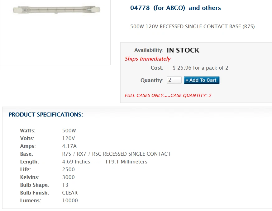 (2) bulbs for half the price of one! (1) new , (1) used (removed from working lamp), both in original packaging. These are INCREDIBLY bright! Light up your space with this high-quality halogen bulb from Westinghouse. With a clear white light color and 3000K warm color temperature, this bulb will add a cozy and inviting atmosphere to any room. The RSC base is easy to install and the 500W bulb provides an impressive 10,000 lumens of brightness. Made from durable glass, this Westinghouse 04778 model is designed to last for ~2500 hours. Suitable for use in a variety of lamps, lighting fixtures, and ceiling fans, this halogen bulb is a versatile and reliable choice for any home. Buy now and enjoy the warm and inviting ambiance of this high-quality light source.