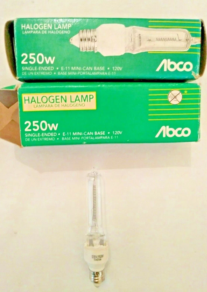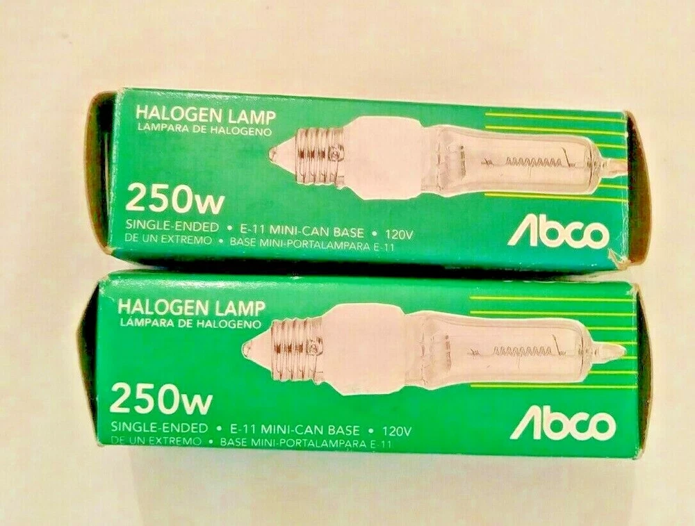 These are 2 NEW OLD STOCK - Abco (Westinghouse) HALOGEN Lamp Light . E-11 Mini Candelabra Base. Single Ended.. 120V #04469.. 250Q/CL. New Old Stock. 1994