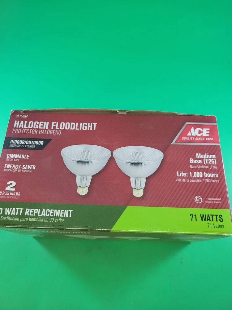 Illuminate your indoor and outdoor space with this top-of-the-line ACE halogen floodlight. With 90 watts of power, this floodlight provides 1325 lumens of bright light, making it perfect for enhancing your home's security and outdoor ambiance. The PAR38 bulb shape code ensures a wide and even distribution of light, while the 120 V voltage makes it compatible with both indoor and outdoor installation areas. Designed for ease of use, this floodlight features a simple installation process and is perfect for outdoor lighting in your yard, garden, or other outdoor living spaces. With two lights included, you can rest assured that your home and outdoor area will be well-lit and secure. Upgrade your home's lighting technology with this high-quality ACE halogen floodlight today! Our merchandise has been generously donated by the friends and families of Community Mainstreaming Associates (CMA). All proceeds from the sale of this item benefit CMA, a 501c3 charity supporting adults with intellectual and developmental disabilities. Thank you for your support.