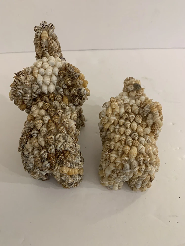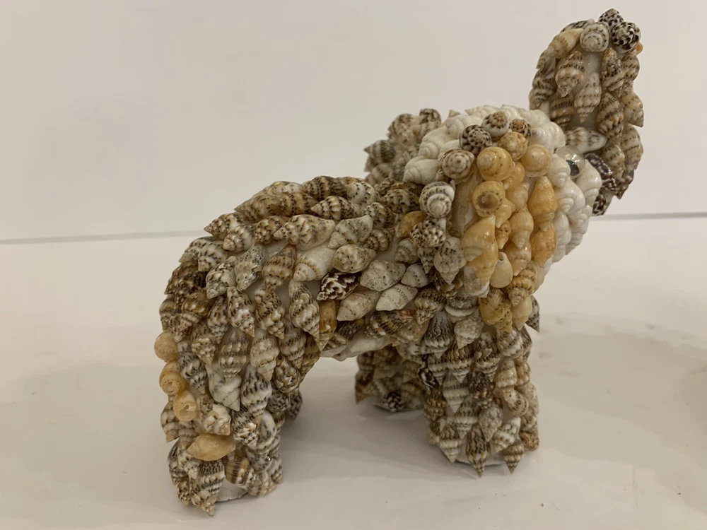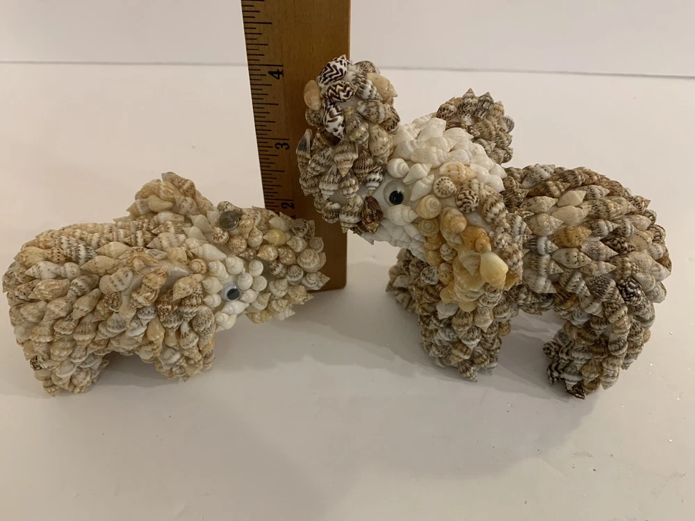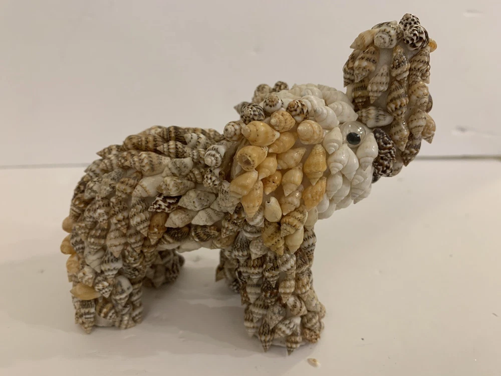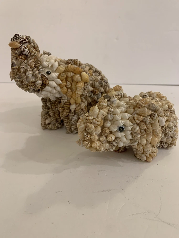 Set 2 Sea Shell Encrusted Elephants Trunks Up Figurines Handmade in Philippines Collectible Coastal decor A few missing seashells not very noticeable- refer to pics Approximately 4” and 2”H