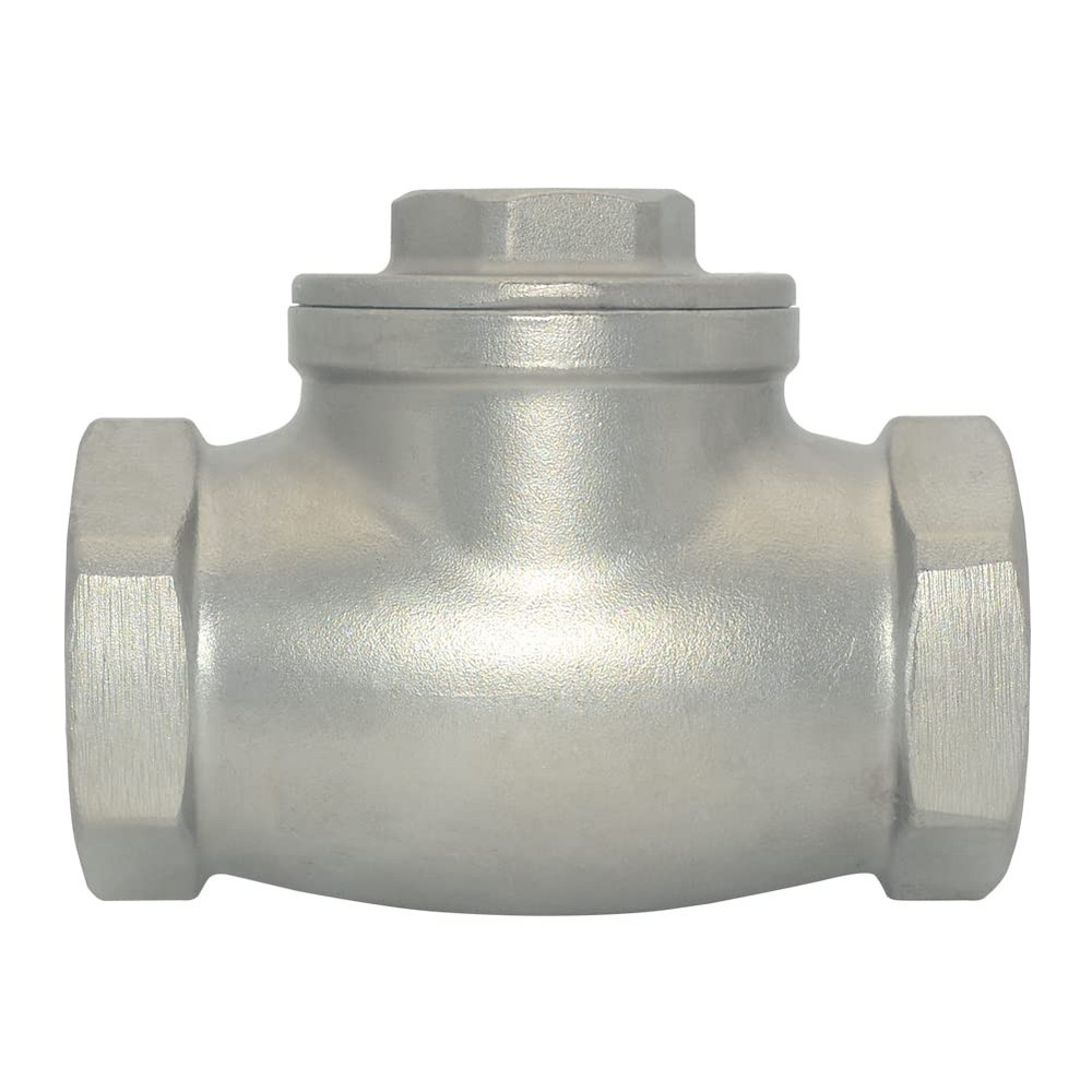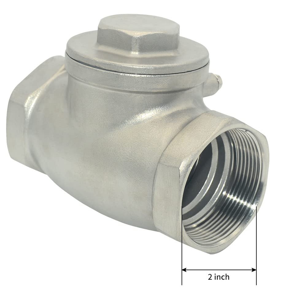 Package Included:1 piece x Check Valve NOTE: Check valves do not create a 100% seal against backflow like a ball valve would. If prevention of backflow is desired, two check valves should be used in series with each other. Any fluid which finds its way past the first check valve is unlikely to have enough pressure to pass through the 2nd. For use with biodiesel, this check valve will require changing of the NBR seals to a more resistant seal manufactures pipe nipples following ISO 9001 standards for quality assurance. The company distributes pipe fittings in the United States and Canada. Body Material:Stainless Steel 316,200PSI/PN16,ANSI B1.20.1 Working Pressure 200 WOG,Port Types:Female x Female threaded Temperature range: -60 to 450 degree Fahrenheit,Suitable for full range of liquids and gas Check valves are used to help direct flow in one direction. The stainless steel bodies and PTFE seals are highly corrosion resistant allowing these check valves to be used with a wide variety of fluids including, but not limited to water, oil, gas, air, light alkali's, acids, biodiesel, fuels and alcohols. Swing check valves are for horizontal use only. When fluid pushes on the stopper in the correct direction, it will "swing" open to allow flow. If flow moves in the opposite direction, it will swing shut. The check valve cannot be used in vertical applications as gravity may affect the function of the swinging motion.