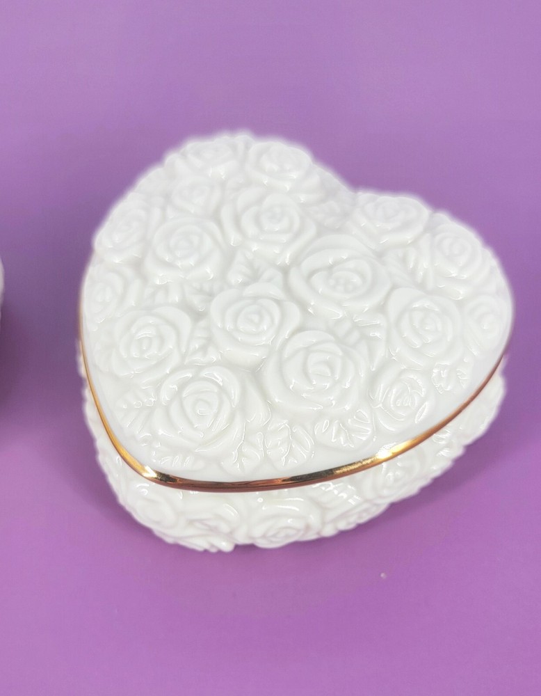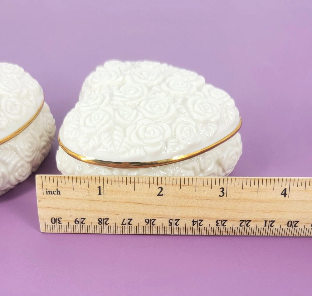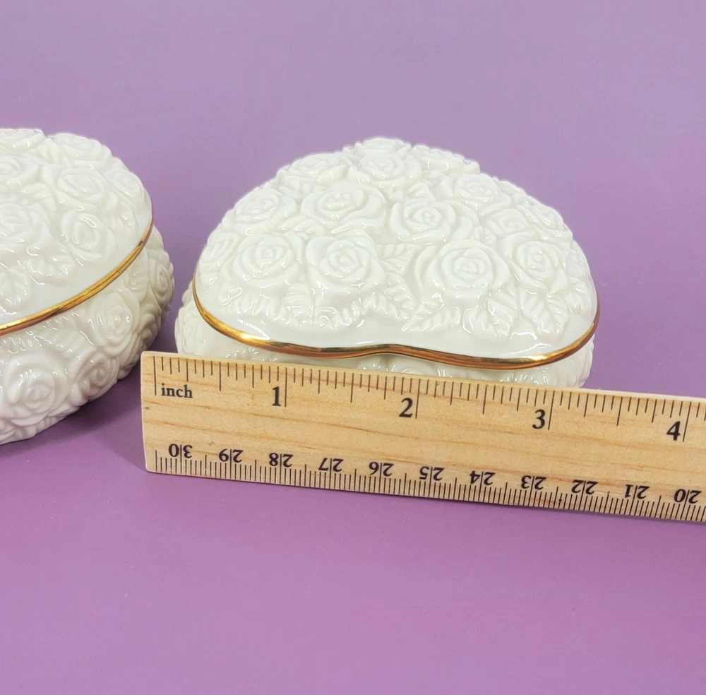 BRAND: Pair of Lenox Rose Covered Ivory Porcelain Heart Shaped Romantic Jewelry/Keepsake Dishes. Made in China. Loc/L3 COLORWAY: Ivory, Gold Metallic. SIZE: Approximately 1.5" Tall, 3" Long, and 3" Wide. CONDITION: Pristine, like new, pair of beautiful Lenox Porcelain rose covered heart shaped trinket/keepsake/jewelry covered dishes. Excellent quality and in beautiful condition. No signs of chips, cracks, crazing, or damage. Please see my photos for exact details. They are very romantic and make a lovely gift. Thank you so much for stopping by today and have a fantastic evening!