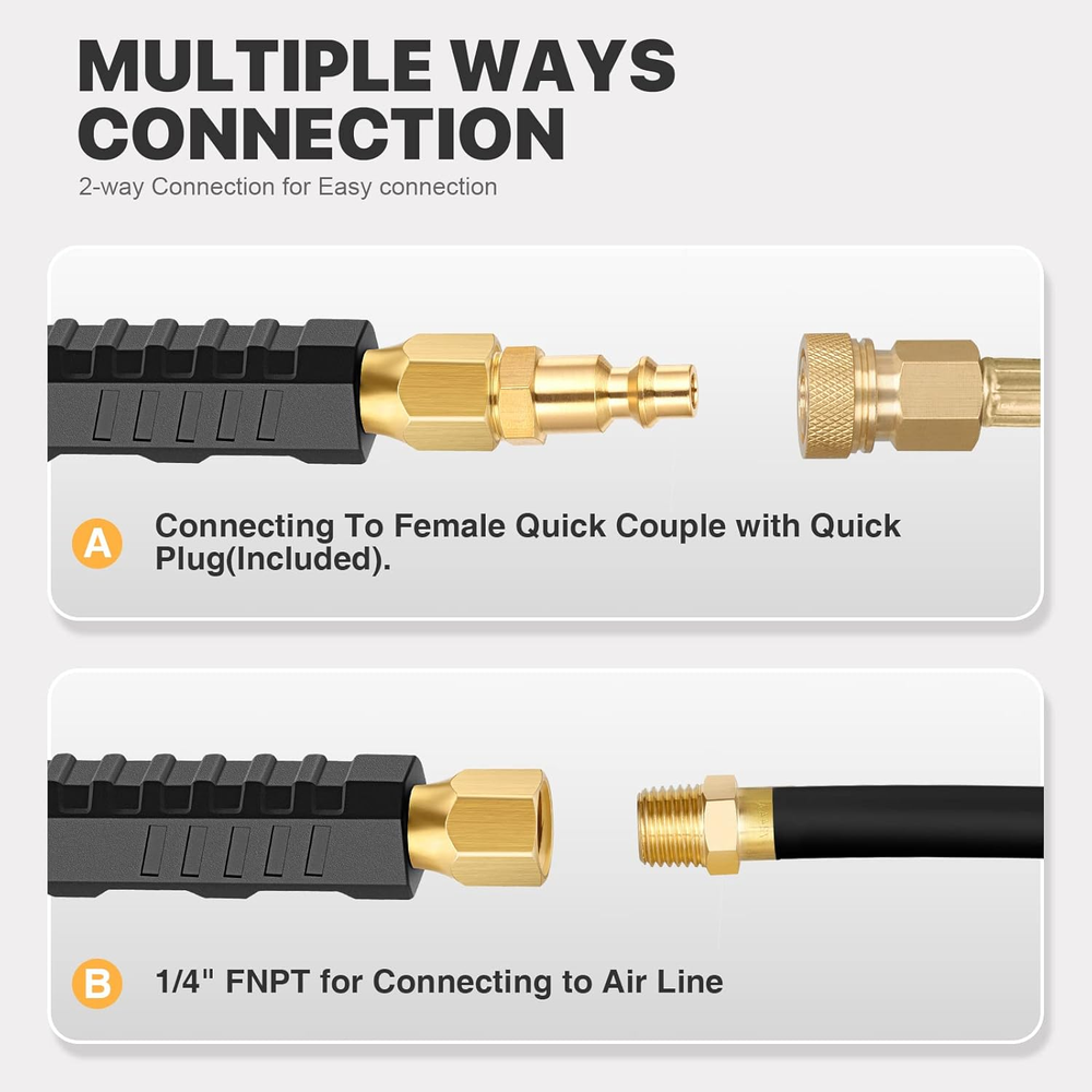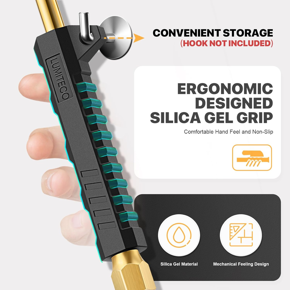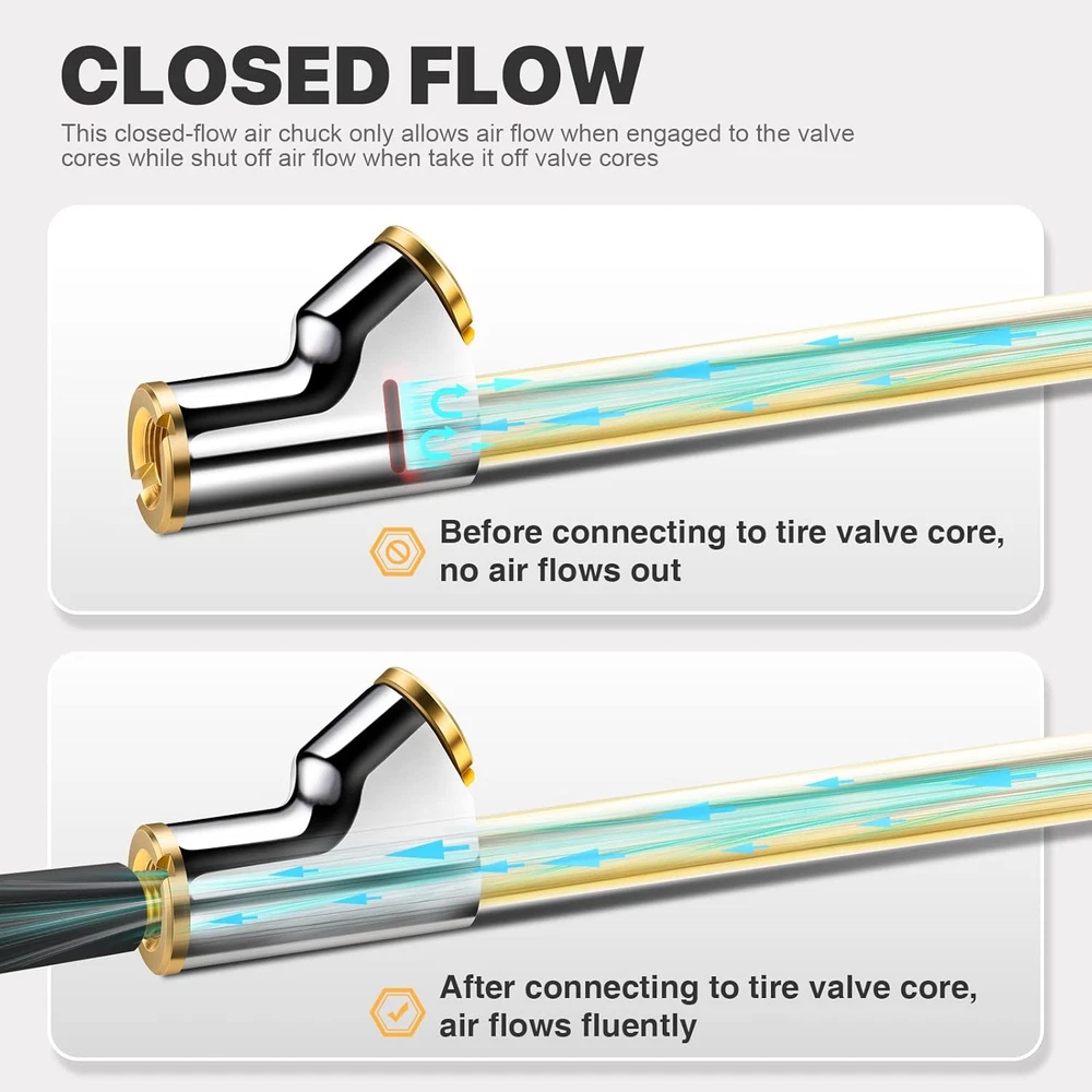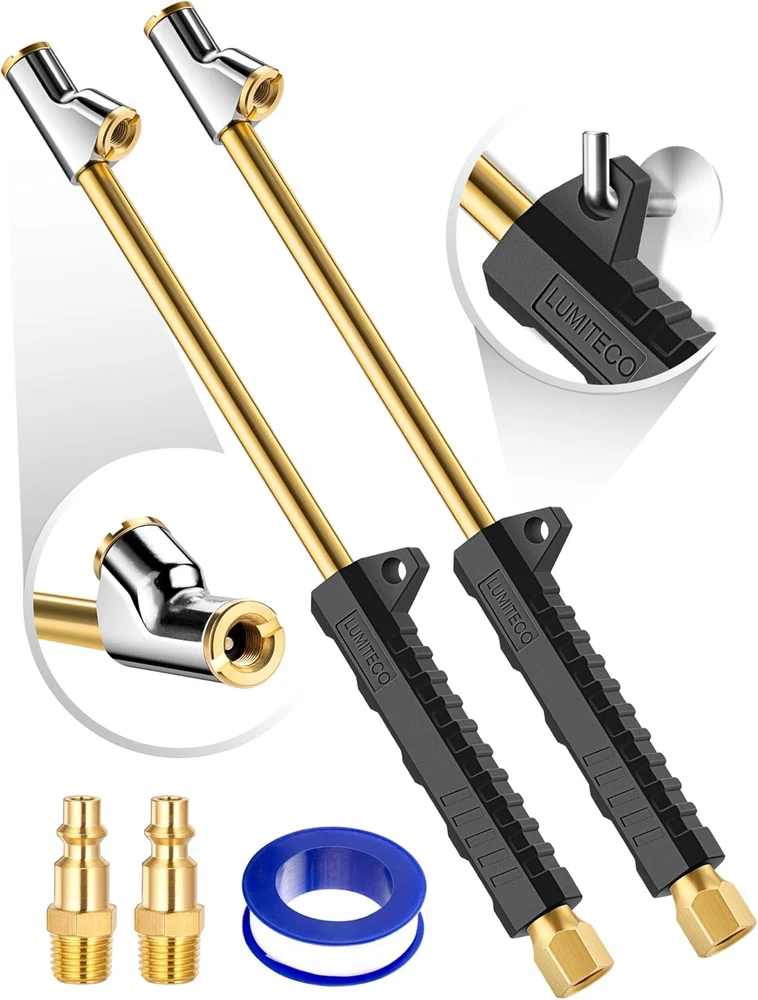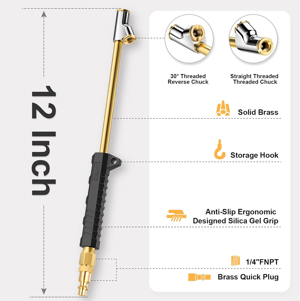 [12'' EXTENDED REACH DUAL HEAD AIR CHUCK] 12" lengthened air rod along with quality dual air chuck head, especially designed for truck, RV, bus' dual wheels and hard-to-reach tire valves. Straight foot air chuck for inner tires or hard-to reach wheels and 30° reverse chuck better for outer wheels. [SOLID BRASS MADE & ERGONOMIC DESIGNED RUBBER GRIP] LUMITECO tire air chuck is constructed with high quality brass body and a zinc alloy air nozzle, and the standard quick plug is also made with solid brass. An ergonomic mechanical designed rubber grip provide comfortable hand feel and non-slip inflating operation. Definitely a perfect choice no matter for business or household use, will serve you faithfully for years. [CLOSED FLOW & INNER THREAD HAND FREE DESIGN] Both air chuck ends with lock on valve core threads, push it on tire valve stems firmly and lean it slightly to ensure no air leakage, when inflating finished, align it back straight to valve stem and pull it off. This closed-flow air chuck only allows air flow when engaged to the valve cores while shut off air flow when take it off valve cores. All these bring you an easy one-hand inflating operation. [MULTIPLE WAYS EASY CONNECTION] This premium air chuck featured a 1/4" FNPT thread for easily connected to most air compressor's air lines or tire inflator gauge. Also including a standard 1/4" male quick plug, for conveniently and swiftly connecting to air lines female quick couple. This air chuck not only for dual wheels also ideal for conveniently inflating other tires with schrader valve, such as bikes, motorcycle, car, etc. [YOU WILL RECEIVE] Includes 2 pcs straight foot air chuck with grip handle, 2 pcs standard 1/4" male quick plug, 1 pcs teflon tape. If you are looking for a durable air chuck set, this one is for you. Just buy with confidence today, we always stand behind all of our items! Product Description