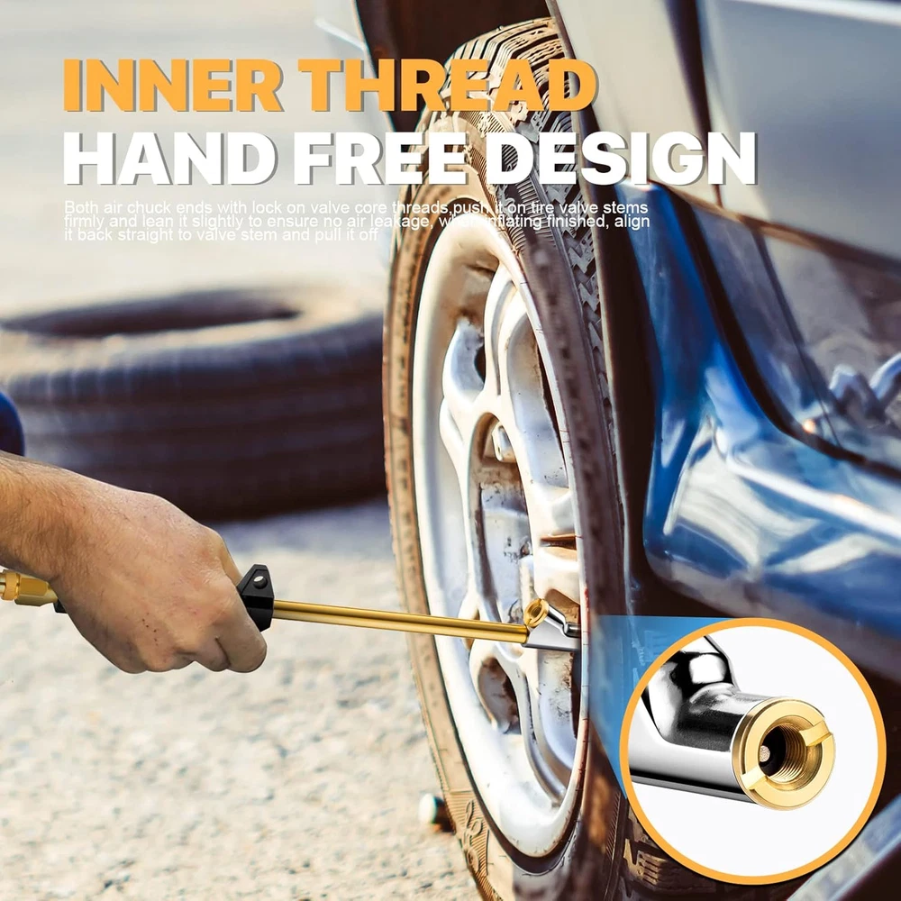 This dual-head air chuck is a game-changer for filling tires on trucks, RVs, and dual wheels! The 12" extended reach easily accesses hard-to-reach valves, while the straight and 30° reverse chucks make inner and outer tires a breeze. Built with solid brass and a comfy rubber grip, it's durable and easy to handle. No more struggling—just quick, efficient air-ups every time. Perfect for pros and DIYers alike!