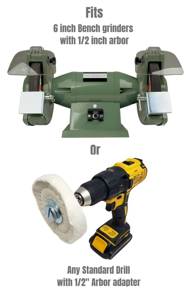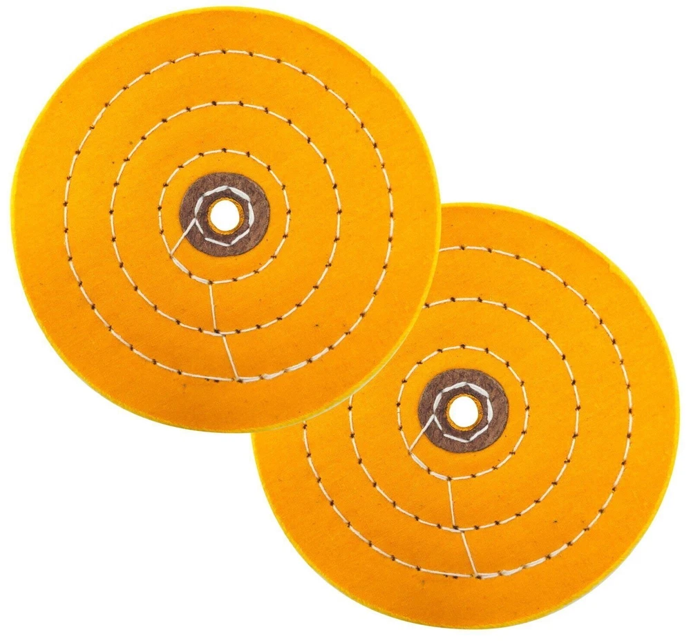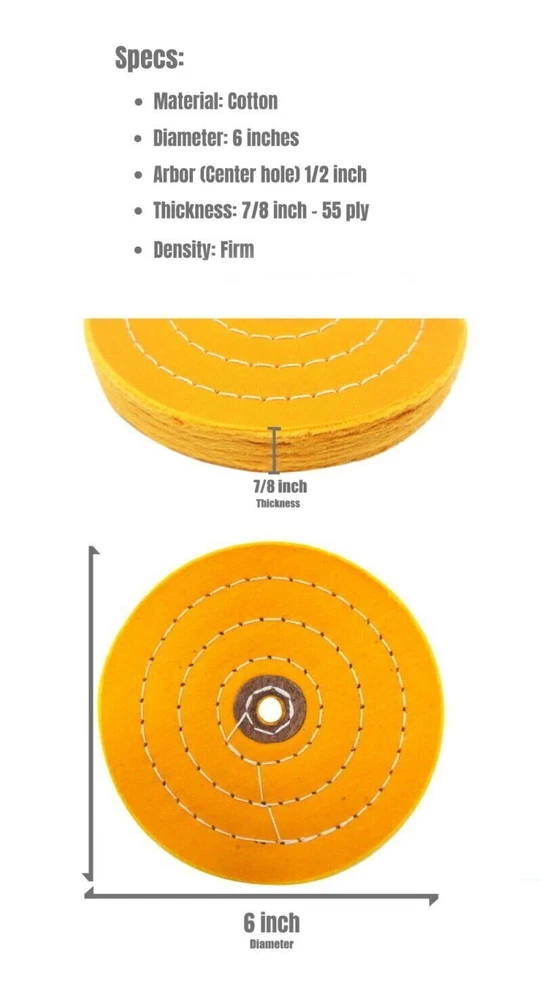 Versatile and can be used with any Buffer or Bench Grinder The package includes two-pack spiral sewen cotton buffing wheels, 6 inches in diameter, and features a 1/2 inch arbor hole, leather lines to withstand wear and tear, and can be used with 1/2 inch arbor bench grinders or buffing machines. Leverage the power of your bench grinder and transform it into a buffing machine! Amazing Quality Ideal for buffing and polishing a variety of surfaces with the appropriate compound. It can be used on metal, wood, acrylics, and plastics, and painted surfaces. Just add the buffing compound suitable for the material you are working on and buff it to a high gloss finish. The cotton wheels are great at buffing compound transfer and will work on anything you put it through. Yellow Wheels - Firm Made of 100% cotton with a higher thread count to create a firmer, more dense buffing wheel that is ideal for the first buffing stages or cuts, stacked in 55 ply (about 7/8 inch thick). Concentric sewing adds firmness without sacrificing flexibility and Aggressive cutting action Use for heavy-duty metal cleaning, buffing, deburring sharpened edges, and removing scratches. White Wheels - Soft They are made of 100% cotton with a high thread count, engineered to be a softer and more flexible buffing wheel, ideal for the final buffing stages, stacked in 70 ply (about 1 inch thick). Concentric sewing adds firmness without sacrificing flexibility and Aggressive cutting action. Ideal for polishing metal and producing a mirror-like glossy finish with the appropriate polishing compound You will receive a pack of 2 buffing wheels, each is 6 Inch Diameter, 1/2-inch Center Hole (Arbor) , 70 ply, 1 Inch Thick Made with high quality cotton material, engineered to be soft and fluffy Concentric sewing adds some firmness without sacrificing flexibility and cutting action Center hole on buffing wheels fits on standard 1/2-inch arbors of bench grinders and buffing machines, Leather lined to enhance clamping and protect from wear Ideal for polishing metal and producing a mirror- like glossy finish with the appropriate polishing compound