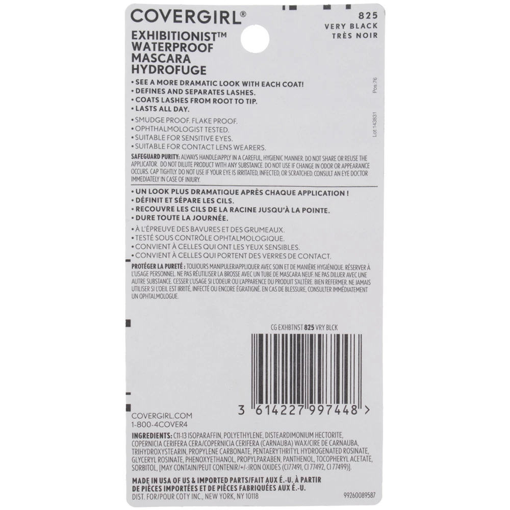 Product Description Let your lashes steal the show with Covergirl Exhibitionist Mascara. This volumizing mascara glides on smooth to give you bold, thick lashes that stand out. Wear it to the beach or a pool party with no worries—the waterproof formula keeps your lashes set, and just one coat is all it takes for a longer, defined look. This formula keeps lashes soft with no flaking or smudging, so your gorgeous lashes stay at the center of attention. Pro-Tip: Apply Covergirl Exhibitionist Mascara Primer beforehand for an extra boost of volume COVERGIRL Exhibitionist Waterproof Mascara, Very Black, 0.3 oz - SHOW-STOPPING VOLUME: Create full, defined lashes that stand out with this volumizing mascara - WATERPROOF FORMULA: Lashes stay bold no matter what comes your way - SMOOTH APPLICATION: Formula glides on smooth with no flaking or smudging - ONE COAT IS ALL IT TAKES: Get bold, longer lashes with just one application - CRUELTY-FREE: Covergirl products are Leaping Bunny Certified by Cruelty-Free International, meaning they are never tested on animals Ingredients C11-13 Isoparaffin, Polyethylene, Disteardimonium Hectorite, Copernicia Cerifera Cera/Copernicia Cerifera (Carnauba) Wax/Cire De Carnauba, Trihydroxystearin, Propylene Carbonate, Pentaerythrityl Hydrogenated Rosinate, Tall Oil Acid, Phenoxyethanol, Propylparaben, Panthenol, Tocopheryl Acetate, [May Contain +/-: Iron Oxides (Ci 77491, Ci 77492, Ci 77499) Product Description Let your lashes steal the show with Covergirl Exhibitionist Mascara. This volumizing mascara glides on smooth to give you bold, thick lashes that stand out. Wear it to the beach or a pool party with no worries‚Äîthe waterproof formula keeps your lashes set, and just one coat is all it takes for a longer, defined look. This formula keeps lashes soft with no flaking or smudging, so your gorgeous lashes stay at the center of attention. Pro-Tip: Apply Covergirl Exhibitionist Mascara Primer beforehand for an extra boost of volume COVERGIRL Exhibitionist Waterproof Mascara, Very Black, 0.3 oz - SHOW-STOPPING VOLUME: Create full, defined lashes that stand out with this volumizing mascara - WATERPROOF FORMULA: Lashes stay bold no matter what comes your way - SMOOTH APPLICATION: Formula glides on smooth with no flaking or smudging - ONE COAT IS ALL IT TAKES: Get bold, longer lashes with just one application - CRUELTY-FREE: Covergirl products are Leaping Bunny Certified by Cruelty-Free International, meaning they are never tested on animals Ingredients C11-13 Isoparaffin, Polyethylene, Disteardimonium Hectorite, Copernicia Cerifera Cera/Copernicia Cerifera (Carnauba) Wax/Cire De Carnauba, Trihydroxystearin, Propylene Carbonate, Pentaerythrityl Hydrogenated Rosinate, Tall Oil Acid, Phenoxyethanol, Propylparaben, Panthenol, Tocopheryl Acetate, [May Contain +/-: Iron Oxides (Ci 77491, Ci 77492, Ci 77499) Suggested Use Step 1. Apply primer sweep formula from root to tip Step 2. Wait 30 seconds to dry Step 3. Apply your favorite Lash Blast mascara to build dramatic lash thickness Warnings Always handle/apply in a careful, hygienic manner, Do not share or reuse the applicator. Do not dilute product with any substance. Do not use if change in odor or appearance occurs. Cap tightly, Do not use if your eye is irritated, infected or scratched. Consult an eye doctor immediately in case of injury Disclaimer The product descriptions and instructions provided by vitabox.com are for informational purposes only and are qualified in their entirety by the information available from manufacturers of the products. You should carefully read all product packaging, and contact the manufacturer with any questions before using a product. While we endeavor to ensure that product descriptions are current, manufacturers sometimes change their products. We are not liable for inaccuracies or misstatements about products. We do not provide medical advice or recommendations. You should not use the information provided by vitabox.com for diagnosing or treating a health problem or disease. If you have or suspect that you have a medical problem, immediately contact your health care provider. Information and statements regarding dietary supplements have not been evaluated by the Food and Drug Administration or any other government agency and are not intended to diagnose, treat, cure, or prevent any disease.