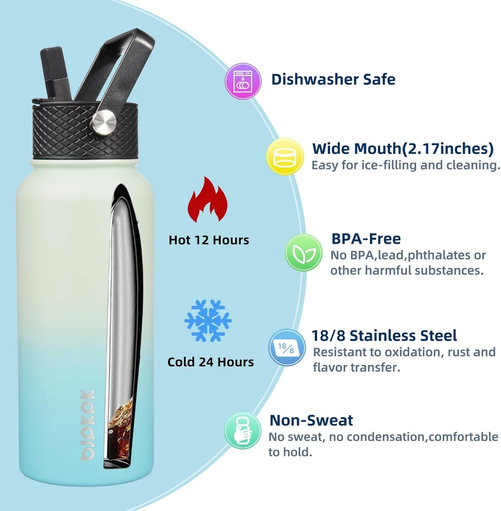 Store New Arrivals Add to Favorite View Feedback Contact 2 Pack Insulated Water Bottles with Straw Lids, 32Oz Stainless Steel Metal Water Bottle with 6 Lids, Leak Proof BPA Free Thermos, Cups, Flasks for Travel, Sports (Army Green+Mint) Description Item model number TK32oz-Army Green+Mint Capacity 32 Fluid Ounces Number of Items 2 Country of Origin China Theme Travel, School, Sport, Gym With Lid Yes Is Microwaveable No Cap Type Straw Cap Product Dimensions 3.5"W x 9.6"H Material Stainless Steel, Metal Model Name Insulated Water Bottle Included Components Straws X 4, Insulated Water Bottles X2, Straw Brushs X 2, Lids X 6 Age Range (Description) Adult Is Dishwasher Safe Yes Item Weight 1.86 pounds Special Feature Sweat Resistant, Wide Mouth, Double Wall Vaccum, Leak Proof, Dishwasher Safe Color Army Green+Mint Recommended Uses For Product Water Base Diameter 3.5 Inches Product Care Instructions Dishwasher Safe Size 32oz(950ml) FULLY EQUIPPED: BJPKPK 2 pack metal water bottles equipped 2 insulated water bottles, 6 lids, 4 straws and 2 straw brush to meet your every need. Flex removable lids for drinking smoothie or fruit drinks. Spout lids for hot water. Straw lids for iced beverages. All of the 6 lids are convenient to carry, BPA FREE and leak proof 2 PACK INSULATED WATER BOTTLE: BJPKPK insulated water bottles with straw lids use double-walled vacuum insulation technology to keep your beverage cold for up to 24 hours, or hot for up to 12 hours, make sure you enjoy your favorite beverages at the most suitable temperature all day PREMIUM MATERIALS: BJPKPK metal water bottles made with high-quality 18/8 food-grade stainless steel, ensuring its durability and rust-resistant quality. With a powder coating finish for a secure grip, a wide-mouth opening for easy ice filling and cleaning, this sports water bottle is perfect for office, gym, traveling, hiking and more SWEAT-FREE & REUSABLE: Say goodbye to those annoying sweat rings on your desk or in your car, our thermos water bottle is designed to be sweat-free! Get more out of your outdoor adventures with our reusable water bottle that can be refilled multiple times, reducing single-use plastic waste and promoting a sustainable lifestyle IDEAL PRESENT CHOICE: BJPKPK 2 pack water bottles comes with multiple colors combinations, and various sizes (18 oz, 22 oz, 27 oz, 32 oz, 40 oz) to choose from according to your need. Whether you're at the office or out and about, this thermos bottle is the perfect accessory to complement any outfit. It is also a great present for your loved ones to help them keep hydrated and healthier BJPKPK 2 Pack Insulated Water Bottles with Straw Lids, 32oz Stainless Steel Metal Water Bottle with 6 Lids, Leak Proof BPA Free Thermos, Cups, Flasks for Travel, Sports (Army Green+Mint) ABOUT US We offer the best prices around on high quality products. Our E-store includes media such as books, movies, music and games while offering electronics, toys, sporting apparel, clothing, tools, general home, garden items and more. SHIPPING We are always working hard to ensure your package arrives as soon as possible. Please understand that some factors like weather, high postal traffic, and the performance of shipping companies are outside of our control. We offer free shipping to the lower 48 states and ship within 2 business days of payment, usually sooner. We do not accept P.O. Boxes. Please provide a physical address. For shipping outside of the continental USA, we only use eBay's Global Shipping Program.The item is shipped to KY and then sent to the rest of the world. International customers are responsible for all duties and taxes. Continue to check out in order to calculate costs for shipping the item to your country. Messages regarding eBay's Global Shipping Program MUST be directed at eBay EXCLUSIVELY. RETURNS We offer a 30-Day Return Policy on items which you are not completely satisfied with. You have the option for a full-refund or an exchange of the item. No returns are available on items shipped outside of the USA. PAYMENT We accept PayPal. CONTACT US This page content is yet to come Please ad us to your favorite seller and visit again later Thank You CUSTOMER SATISFACTION We try our very best to make sure every customer is completely satisfied. If there's a problem, message us! We're happy to help. WE ACCEPT Copyright © 2021 AutoDS. | All Rights Reserved