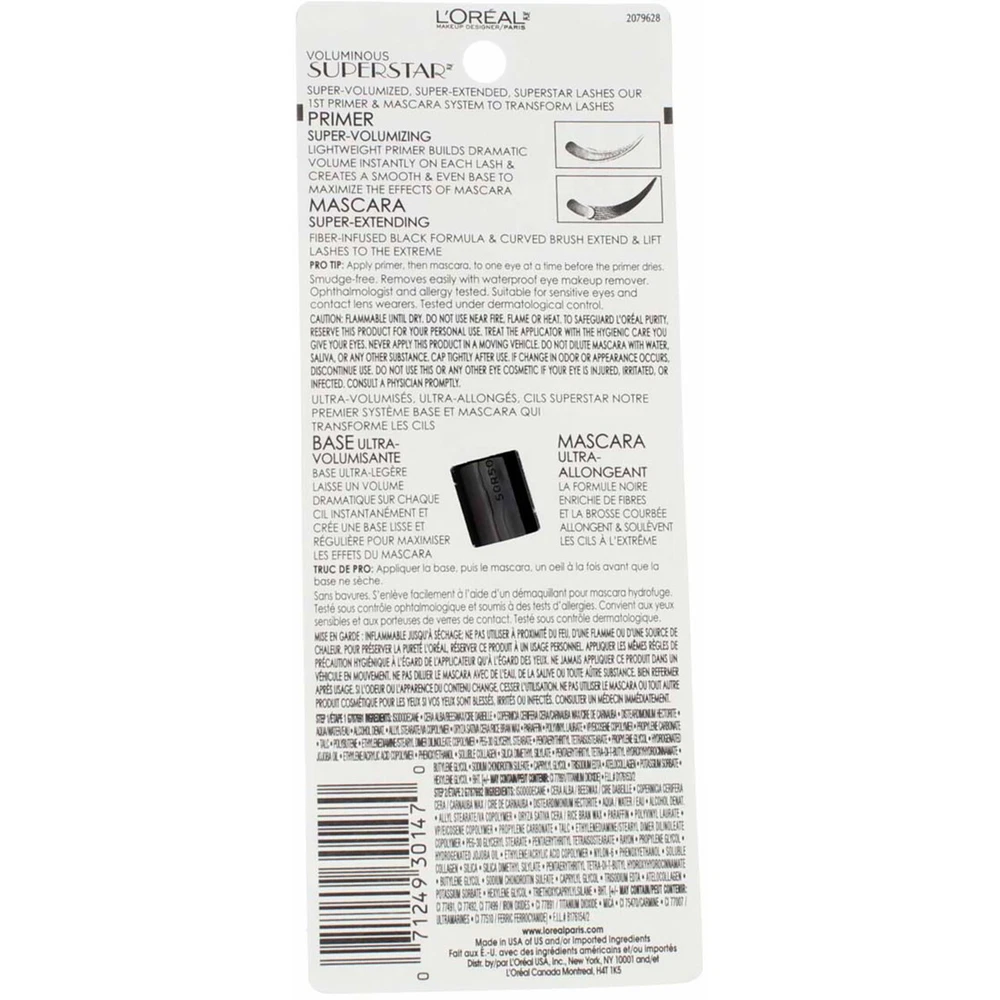 Product Description L’Oral Paris Voluminous Superstar Waterproof Mascara is a two-step primer and lengthening mascara for a show-stopping lash effect. Super-volumizing primer builds dramatic volume on every lash and creates an ultra smooth base to maximize mascara performance. Super-extending mascara with a fiber-rich black formula.Super-volumized, Super-extended lashes,Primer and Fiber Mascara System,Superstar Lashes,Smudge proof, Waterproof mascara Start by applying the Super-Volumizing primer making sure to coat every lash. Ingredients Isododecane, Cera Alba/Beeswax/Cire Dabeille, Copernicia Cerifera Cera/Carnauba Wax/Cire De Carnauba, Disteardimonium Hectorite, Aqua/Water/Eau, Alcohol Denat., Allyl Stearate/VA Copolymer, Oryza Sativa Cera/Rice Bran Wax, Paraffin, Polyvinyl Laurate, VP/Eicosene Copolymer, Propylene Carbonate, Talc, Polybutene, Ethylenediamine/Stearyl Dimer Dilinoleate Copolymer, Glyceryl Stearate, Pentaerythrityl Tetraisostearate, Propylene Glycol, Hydrogenated Jojoba Oil, Ethylene/Acrylic Acid Copolymer, Phenoxyethanol, Soluble Collagen, Silica Dimethyl Silylate, Sodium Chondroitin Sulfate, Atelocollagen. Instructions Start by applying the Super-Volumizing primer making sure to coat every lash. Then, before the primer dries apply the fiber-rich mascara on top of the primed lashes to create a show-stopping lash look. Repeat on other eye. Product Description L‚ÄôOral Paris Voluminous Superstar Waterproof Mascara is a two-step primer and lengthening mascara for a show-stopping lash effect. Super-volumizing primer builds dramatic volume on every lash and creates an ultra smooth base to maximize mascara performance. Super-extending mascara with a fiber-rich black formula.Super-volumized, Super-extended lashes,Primer and Fiber Mascara System,Superstar Lashes,Smudge proof, Waterproof mascara Start by applying the Super-Volumizing primer making sure to coat every lash. Ingredients Isododecane, Cera Alba/Beeswax/Cire Dabeille, Copernicia Cerifera Cera/Carnauba Wax/Cire De Carnauba, Disteardimonium Hectorite, Aqua/Water/Eau, Alcohol Denat., Allyl Stearate/VA Copolymer, Oryza Sativa Cera/Rice Bran Wax, Paraffin, Polyvinyl Laurate, VP/Eicosene Copolymer, Propylene Carbonate, Talc, Polybutene, Ethylenediamine/Stearyl Dimer Dilinoleate Copolymer, Glyceryl Stearate, Pentaerythrityl Tetraisostearate, Propylene Glycol, Hydrogenated Jojoba Oil, Ethylene/Acrylic Acid Copolymer, Phenoxyethanol, Soluble Collagen, Silica Dimethyl Silylate, Sodium Chondroitin Sulfate, Atelocollagen. Instructions Start by applying the Super-Volumizing primer making sure to coat every lash. Then, before the primer dries apply the fiber-rich mascara on top of the primed lashes to create a show-stopping lash look. Repeat on other eye. Warnings Safety Warning: Flammable until dry. Do not use near fire, flame or heat. To safeguard L‚ÄôOreal purity, reserve this product for your personal use. Treat the applicator with the hygienic care you give your eyes. Never apply this product in a moving vehicle. Do not dilute mascara with water, saliva, or any other substance. Cap tightly after use. If change in odor or appearance occurs, discontinue use. Do not use this or any other eye cosmetic if your eye is injured, irritated or infected. Consult a physician. Disclaimer The product descriptions and instructions provided by vitabox.com are for informational purposes only and are qualified in their entirety by the information available from manufacturers of the products. You should carefully read all product packaging, and contact the manufacturer with any questions before using a product. While we endeavor to ensure that product descriptions are current, manufacturers sometimes change their products. We are not liable for inaccuracies or misstatements about products. We do not provide medical advice or recommendations. You should not use the information provided by vitabox.com for diagnosing or treating a health problem or disease. If you have or suspect that you have a medical problem, immediately contact your health care provider. Information and statements regarding dietary supplements have not been evaluated by the Food and Drug Administration or any other government agency and are not intended to diagnose, treat, cure, or prevent any disease.