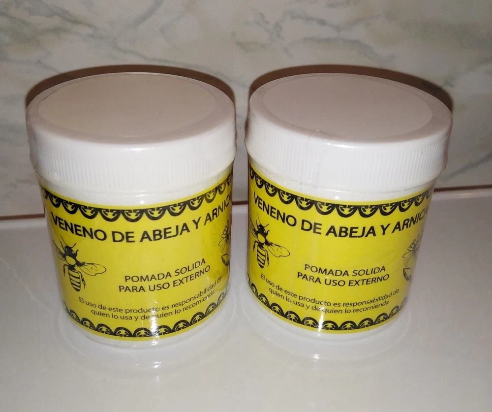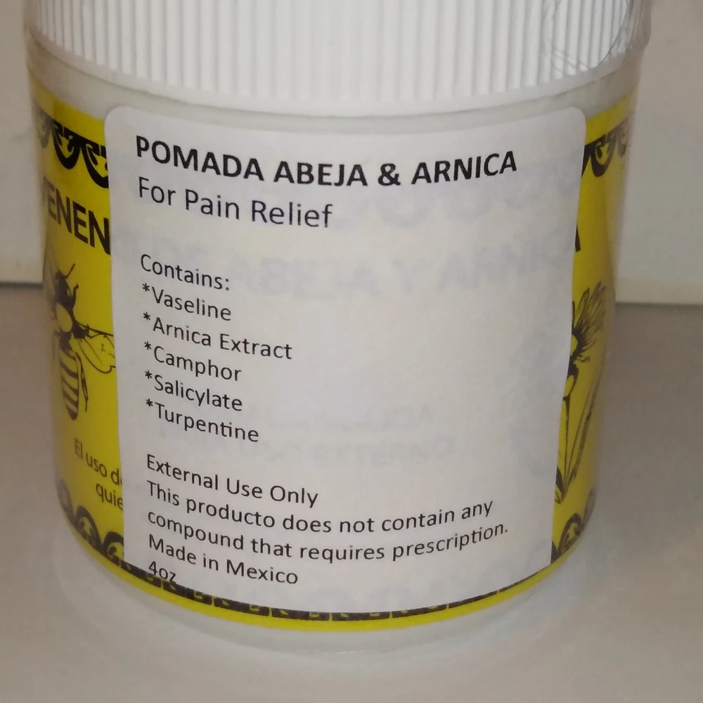 2 Pack Pomada de Abeja y Arnica Para Dolor 100g 3.5oz Each Muscle and Joint Pain Reliever AUCTION IS FOR 2 JARS Directions: Apply with a gentle massage over affected area 1 or 2 times a day, external use only. Ingredients: Vaseline, Arnica Extract, Camphor, Salicylate, Turpentine. Product of Mexico Size: 3.5oz / 100gr. each jar DISCLAIMER The statements made herein have not been evaluated by the Food and Drug Administration. The products & the information provided on this web site are not intended to treat* diagnose*cure*prevent or mitigate any condition or disease. As always, consult with your health care professional before taking any-medication or nutritional supplement. NOTE this product is NOT intended to cure treat any medical condition. Also, this item does NOT contain any prescription grade ingredients.