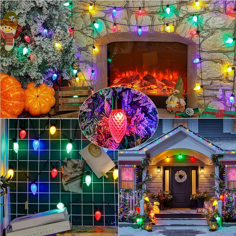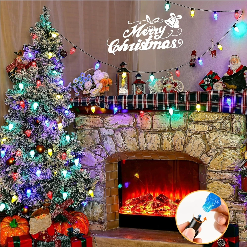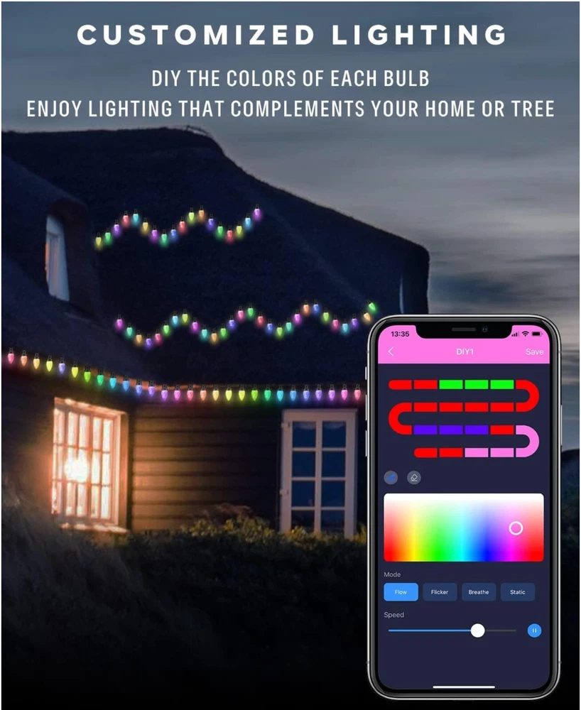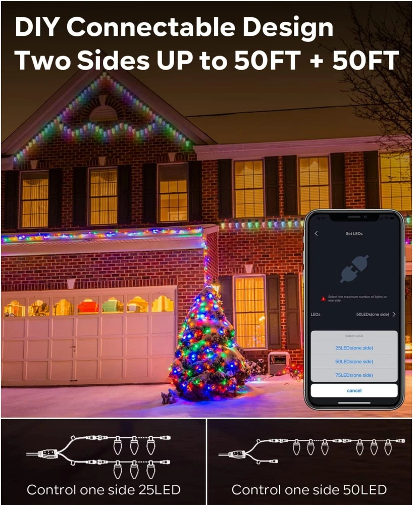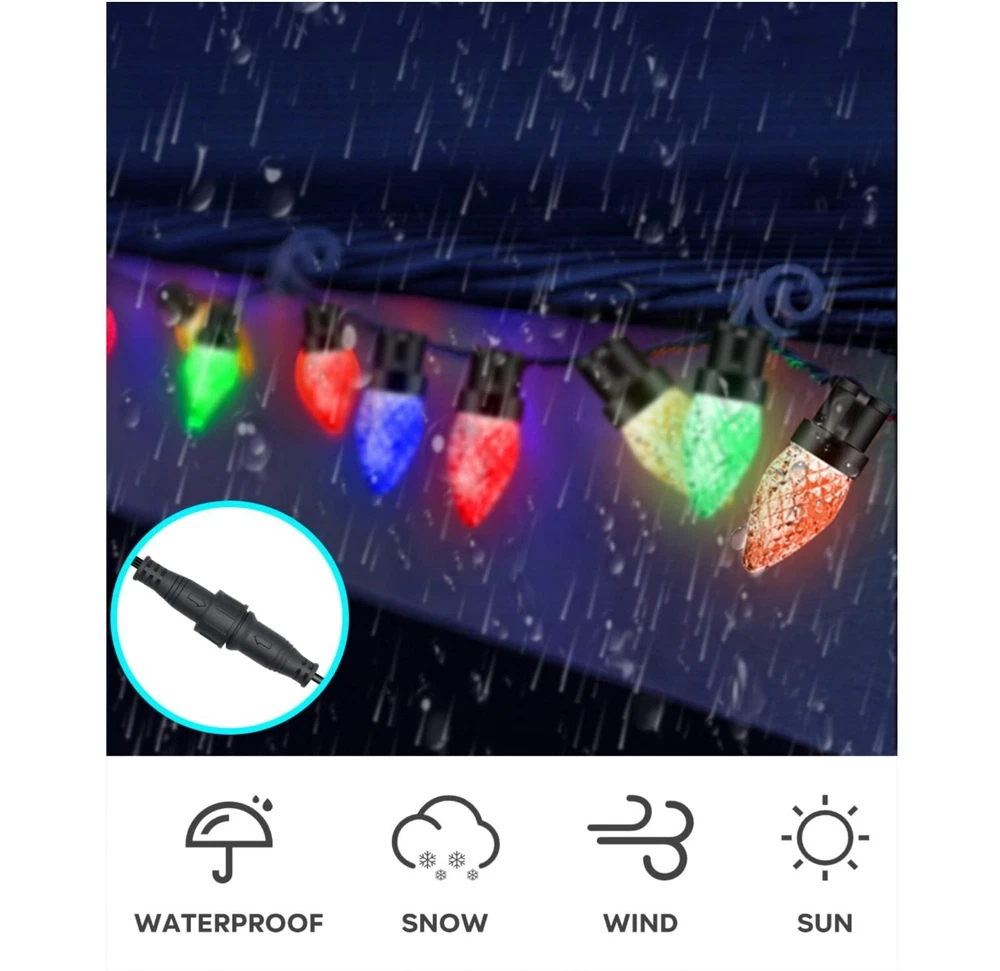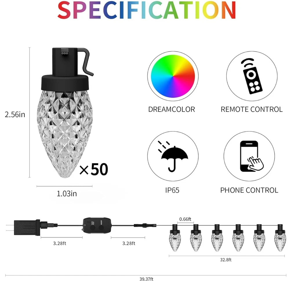 About this item Smart APP & Remote Control -- "Hello Fairy" Bluetooth APP controls the C9 exterior christmas lights, has a custom DIY mode, supports 48 scenes, music sync, brightness, lighting speed, color changing through the multi-function 24-button remote control or smartphone app, timing function. Getting more fun with it! DIY & Dimmable -- No dimmer required, the color changing big bulb Christmas lights outdoor can be dimmed from 1%-100% through the app or remote control. What's more, large c9 twinkle lights not only can be diy, select your favoriate color with flow, flicker, breathe or staic modes, Or strobe, gradient modes, but also adjust speed to meet your need, creating a relaxed and comfortable atmosphere for you, allowing you to Enjoy beautiful nights, parties and gatherings with romantic lighting. Music Rhythm -- The outdoor Xmas twinkle lights has 4 music modes of energy, rhythm, roll, and spectrum. It has a built-in high-sensitivity microphone, and the light will change with the rhythm or melody. The rhythm of music is matched with 16 million colors to choose from, creating a romantic and dreamy atmosphere for you. Timing & Memory Function -- Avatar Controls color changing led Christmas lights has the function of timing and memory. You can set the turn on or off time of the fairy string lights on the APP anytimer to help you save more electricity bills. 98.4ft(150leds) Expandable -- Avatar Controls 2022 updated smart c9 string lights is connectable, with connectors in both directions, allowing up to 3 groups of 75 light beads to be connected together on one side, end to end lights 98.4ft(150led), which can be used for indoor outdoor decoration.(Product is 16+16ft, 25+25leds) Safety & Waterproof -- UL certified power adapter, 24V low voltage is not easy to be damaged after long-term use and maintains a low temperature state. The The IP65 waterproof rating allows the fairy lights to better decorate your house, eaves, fence and patios. Application -- C9 christmas lights outdoor are perfect for indoor/outdoor decoration. Can be used to decorate and illuminate your bedroom, balcony, garden, patio, cafe, bistro, deck, gazebo, fence, backyard widely used in weddings, parties, Christmas decorations, camping and other occasions. Plug in fairy lights can add the perfect ambiance to any space. Wattage: 5 watts
