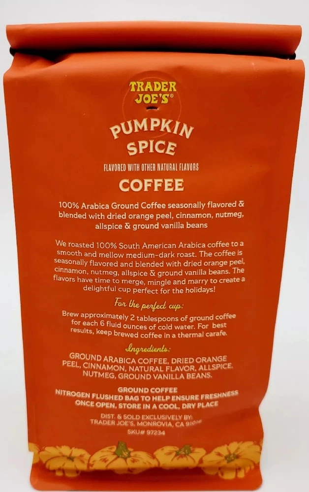 Enjoy the limited edition Trader Joe's 2024 Pumpkin Spice Coffee in every sip. This Arabica coffee grounds is perfect for coffee lovers who enjoy medium dark roast. Each pack contains 14 oz of premium quality coffee that is perfect for any time of the day. The coffee is sourced from the United States and has a unique flavor of pumpkin spice that will leave you wanting more. Perfect for any pantry, this coffee is a must-have for any coffee lover. You are purchasing two packs of specialty coffee This is very limited and seasonal stock up