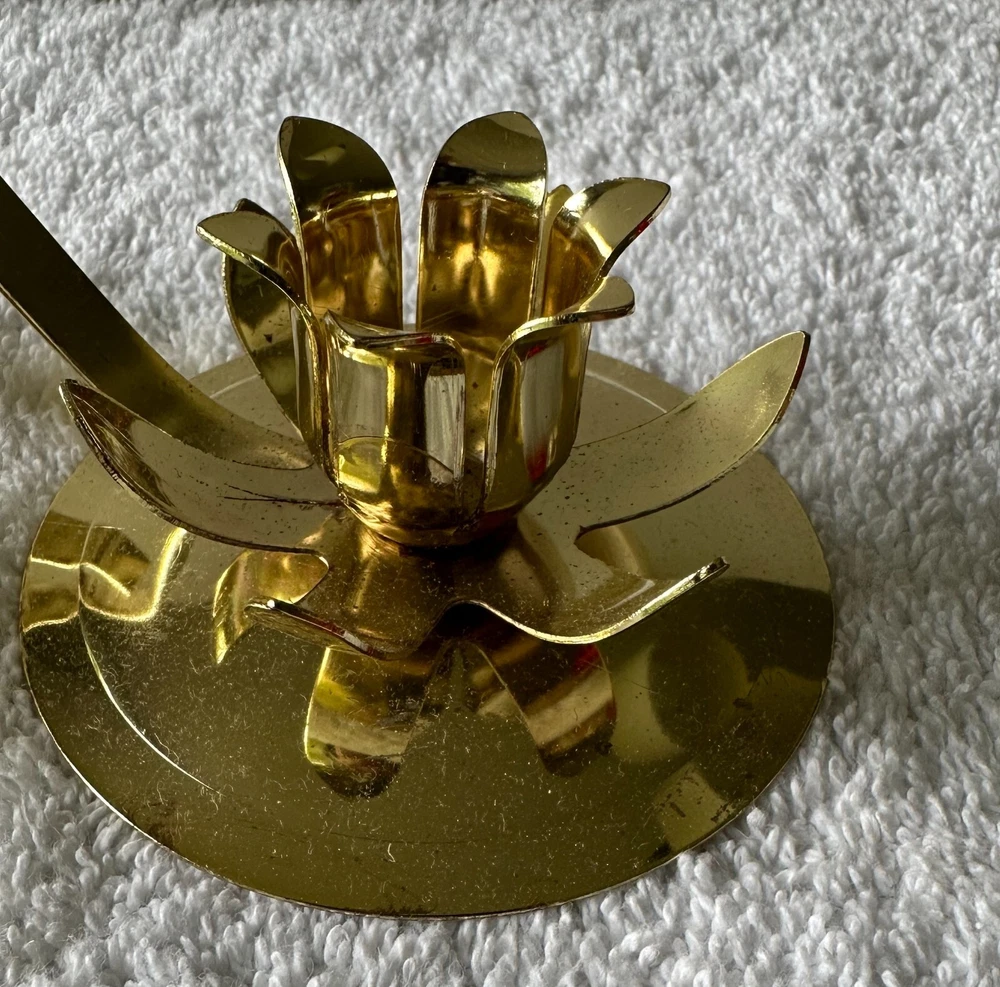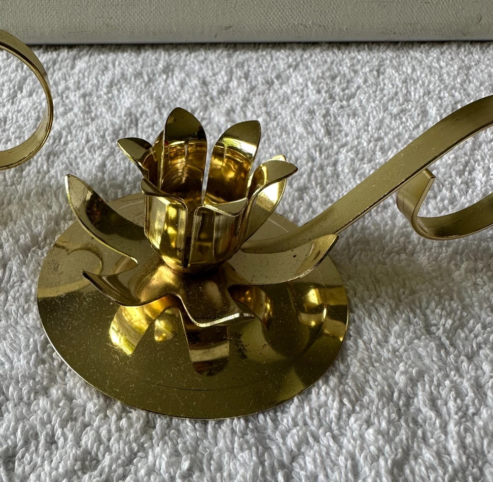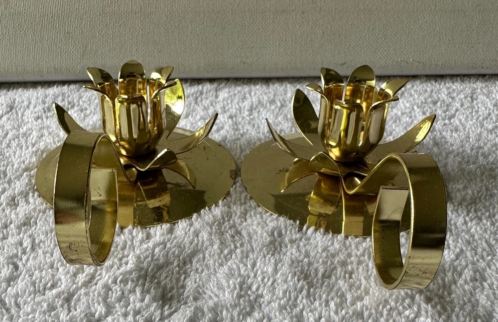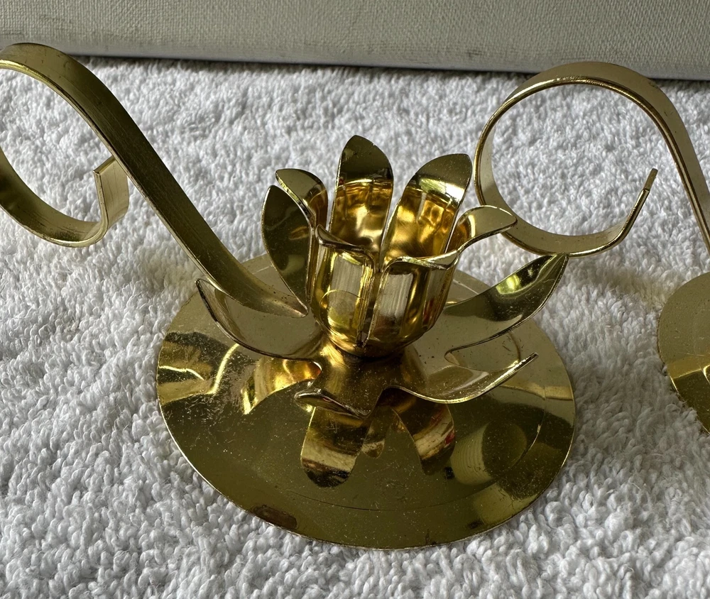 2 Vintage Flower Shaped Christmas Candlestick Holders Goldtone Metal Criterion Bell IOB 2 holders in original box. In great condition. (See all pictures) The holders are 5” long, 3” wide, and 1 1/2” tall. Made in the USA. Will combine shipping. No international shipping. No international shipping. I do not ship to APO/FPO/AE addresses, Alaska, Guam, Hawaii, Puerto Rico, Virgin Islands or PO Boxes. Payment within three days, please. All reasonable effort will be taken to ship your item the same day if payment is received by 5:00 pm est. All listings come from a clean, smoke-free environment. However, I do occasionally buy items from thrift stores or yard sales. I cannot guarantee that these items are from a smoke-free environment. Email with any questions. If unsatisfied with the item you have purchased, please contact me before opening a case on eBay. I am striving for 100% customer satisfaction. pp.6JB