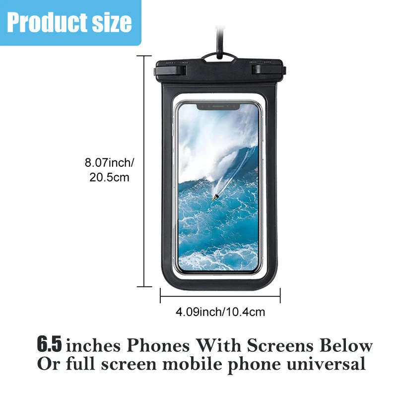 2 Pcs Waterproof Floating Cell Phone Pouch Dry Bag Case Cover For iPhone Samsung Features: 1. BEACH -SUPERIOR WATERPROOF PROTECTION: Certified IPX8 waterproof provides complete protection against water, snow, dust, and sand. Ensure your cell phone stays dry. 2. CASE FRIENDLY: With a size of 6.5 inches, the waterproof phone pouch can fit most cell phones with or without a case, providing double insurance to your phone. 3. RESPONSIVE TOUCH SCREEN: The waterproof phone pouch is made of upgraded PVC material that provides excellent response sensitivity while using your phone, including face ID unlock and calling. 4. CLEAR PICTURE UNDERWATER-CRUISE SHIP : With high transmittance transparency technology, this phone pouch provides a crystal clear photo capture of the underwater world. 5. ADJUSTABLE LANYARD: Comes with a detachable lanyard from 13.8 to 21 inches providing various choices for the length you prefer— by crossing your body or around your neck. 6. TRAVEL : Ideal partner for various activities, such as beach playing, water , swimming, snorkeling, kayaking, rafting, or even taking a shower with your phone in hand. Specification: Color: See as picture showed Material: PC+PVC Applicable to: mobile phones under 6.5 inches Waterproof grade: IP68 Suitable for: swimming, diving, camping, outdoor Compatible with: Most smart phones (under 6.8 inches) iPhone 11 Pro Max, iPhone 11, iPhone 11 Pro, XS Max, XR, XS, X, 8 Plus, 8, 7 Plus, 7, 6s, 6s Plus, 6, 6 Plus, 5s, 5, SE, 5C, 4s, Samsung Galaxy S9 Plus, S9, S8 Plus, S8, S7, S6, S6 Edge, S5, S4, S3, Note 8, 7 etc, Google Pixel 2, Moto G5, V30, G6, S8 Eged, Edge Plus, Oneplus 5T, Oneplus 3T, Oneplus 3, Oneplus2, BLU R1 HD Advance 5.0 Studio Selfie 2 Studio X8 HD LIFE ONE X X2 Energy X2 Vivo 5 mini 5R XL 2 Energy JR etc, Play Z Huawei Honor 5X 6X, Asus Zenfone Moto XT1644 ZTE Axon 7 mini P9 P8 G6 G5 G4 G3 G2 v10 etc, HTC One M10, M9, M8, M7, Nexus 6, 6P, 5, 4, Sony Xperia Z3, Z2, Z1, Nokia Microsoft Lumia BlackBerry etc. Package include: 2 x Waterproof Case Cover 2 x Strap Notice: Please Do A Saftey Test Before Using The Waterproof Case!! 1.Release the snap closure after passing the safety test. 2.Open the case gently. 3.Put your smartphone into it softly. 4.Close the sale smoothly, please make sure press the top of case inside the sale completely. On Nov 12, 2024 at 18:53:26 PST, seller added the following information: