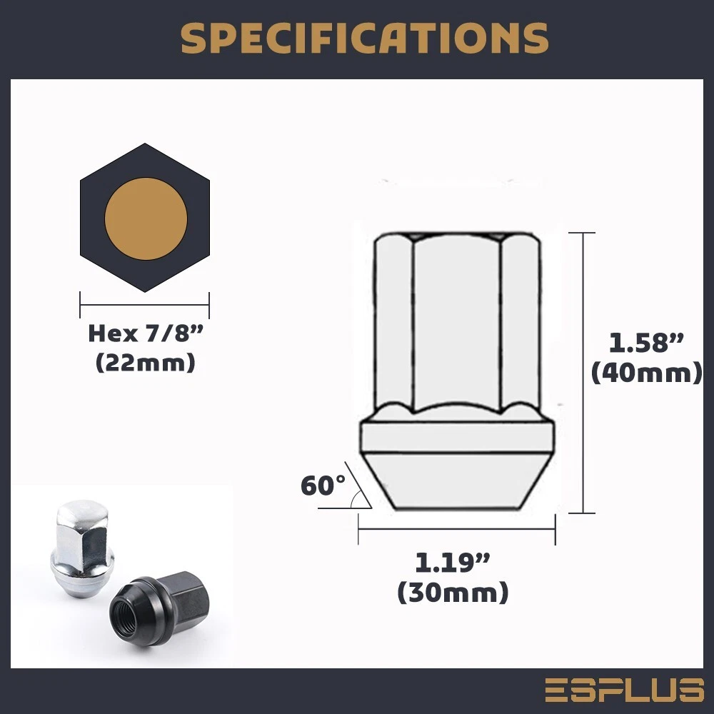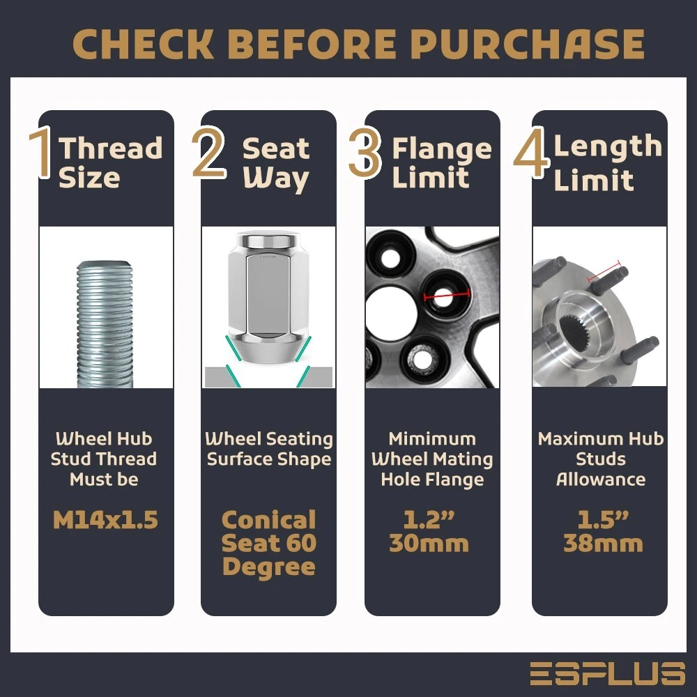 Store Home | Hot Products | Hot Deals | Suscribe for More | Customer Feedbacks | Contact us Categories Universal Lug Nuts OEM Lug Nuts Wheel Locks Conical Seat Lug Bolts Ball Seat Lug Bolts Hub Centric Spacers 4 Lug Wheel Adapters 5 Lug Wheel Adapters 6 Lug Wheel Adapters 8 Lug Wheel Adapters Studs Conversional Adapter 5 Lug HubCentric Adapter 6 Lug HubCentric Adapter Universal Wheel Spacers M14x1.5 OEM Lug Nut / Conical Seat 60 Degree / 30mm Flange / 1.58" Tall Specifications Quantity: Set of 20 Lug Nut Thread Pitch: 14x1.5 Lug Nut Height: 1.58" (40 mm) Lug Nuts Flange: 1.19" (30mm) Seat : 60 Degree Conical Seat Material: 10.9 Grade SCM Heat Treated Steel Color and Finish: Chrome Drive: 7/8" (22mm) Tool Requirement: 7/8" (22mm) Hex Socket Package 20 Pcs Important Notice For stock wheel users, we suggest to use shape of existing lug nuts' Flange , Seat Type , and Height as refernce before buying. Compatibility chart from Ebay is only designated for Thread Pitch check. The actual fitment varies based on the requirements of wheels. Lug nuts/bolts seat has to strictly follow the wheel condition. If you are not sure, please do not hesitate to ask customer service. Our Return Policy If ever you’re not satisfied with your purchase, we offer 30-day return. Returned product must be intact and unused as the same condition of the original shape and package. Upon return, please contact the customer service for Return Merchandise Authorization (RMA) number prior to returning. A 25% restocking fee will be charged for all non-defective products. All refunds will be credited back to the original payment method. About US We strike to provide high quality auto parts. Your satisfaction is our first priority. Should you have any questions, please do not hesitate to contact our customer service for help. Limitation of Liability In no event shall our liability exceed the value of the product(s) sold. In no event shall our company be liable for any direct, indirect, punitive, incidental, special or consequential damages whatsoever arising out of or connected with the use or misuse of any of its products. Fitment Following chart is designated for Thread Pitch check only. Due to aging, your studs may have been changed. Please compare the shape and thread mark with your existing lug nut before buying. Q & A How do I know If this product will fit my car? 1. Use compatibility chart to check Make/Model/Year 2. Check wheel studs are factory default 3. Check wheel studs are less than 1.45” Long 4. Check wheel lug mating surface is 60 Degree Conical Seat 5. Check wheel lug hole flange requirement is 30mm *You can also use existing lug nuts thread/shape as reference Why is the product bottomed out without seat firmly? Your studs are too long to penetrate the max length allowance for the lug nuts Solution: 1. You need longer and deeper lug nuts 2. You need to trim the studs and make it shorter Why is the product too thin that won’t hold my wheel? Your wheel requires large flange lug nuts to hold, for ideal flange size, please refer to your existing lug nuts Solution: 1. You need large flange lug nuts 2. You need to use lug nuts flange adapter to make it fit Why does the product not fit my wheel cap? Most of the wheel caps have clipers that require lug nuts to hold,our lug nuts may not have the same shape to match the clippers Solution: 1. You need to purchase the exactly same lug nuts from the caps 2. You need to remove your wheel caps Why is the thread not matching my wheel studs, but my car is listed in the compatibility chart? Wheel Studs are subjected to be replaced due to aging or repair, after that, you may have different thread than factory default Solution: 1. Check the thread from your existing lug nuts 2. The thread mark is ususally engraved on the side of lug nuts Why does my lug nuts have different mating seat type than the product I purchased? Seat type of mating surface is based on the wheels, different wheels have different mating surface requirements. Some stock wheels may require special mating surface assembling. Solution: 1. Check the matting surface from your existing lug nuts and that from your wheels 2. Alloy stock wheels, steel stock wheels, and aftermarket wheels have different mating specification What is the cut-off time for same day shipping? Cut-off time for shipping is 9:30 am PST every business day excluding weekends and ferderal holidays, The shipping date for weekends and federal holidays moves to next available week days How do I get expeditate shipping for timely purposes? Expeditate shipping is based on delivering address, in rear cases, carrier may experience delay due to operational difficulties. Solution: Contact customer service before placing expediate orders Not receiving my package but tracking says delivered Package may be lost, missent, placed in porch or mail box Solution: 1. Check if shipping address on file is up to date 2. Check surroudings including porch, mail box, door steps etc. 3. File item not receive case to ebay, carrier, customer service How does international order shipping work via eBay Global Shipping Program, and how do I check status? ebay Global Shipping Program (GSP) is eBay hosted international carrier who processes international orders, sellers send product to domestic GSP center for further international transition. Solution: 1. Check with ebay GSP department directly by calling them 2. Check package tracking information tab, there are two parts of shipping, one from seller to GSP center, the other for GSP center to destination How do I change address, cancel, or modify my order after I replaced my order? All the changes and mofications must be requested before shipping via direct on-site messages, once the package tracking is given, you will not be able to make any changes Solution: Contact customer service via on-site messages, not buyer notes How do I handle wrong item sent, missing piecies, defective item, and arrival damaged? We do appologized