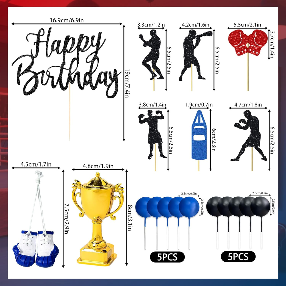 Boxer Birthday Cake Decoration will make anyone want to lace up their gloves and have a boxing-themed party! You will get: 6 x boxing cake decorations, 2 x boxing gloves cake topper, 10 x ball cake toppers(blue,black), 1 X trophy cake topper,1 X Happy birthday cake topper,Product size as shown in the picture! Adorn your dessert table with the perfect Boxing Party decor by adding this Fight Cake Decoration. Easy to assemble:You need spend 1 - 2 minutes to assemble. Product description
