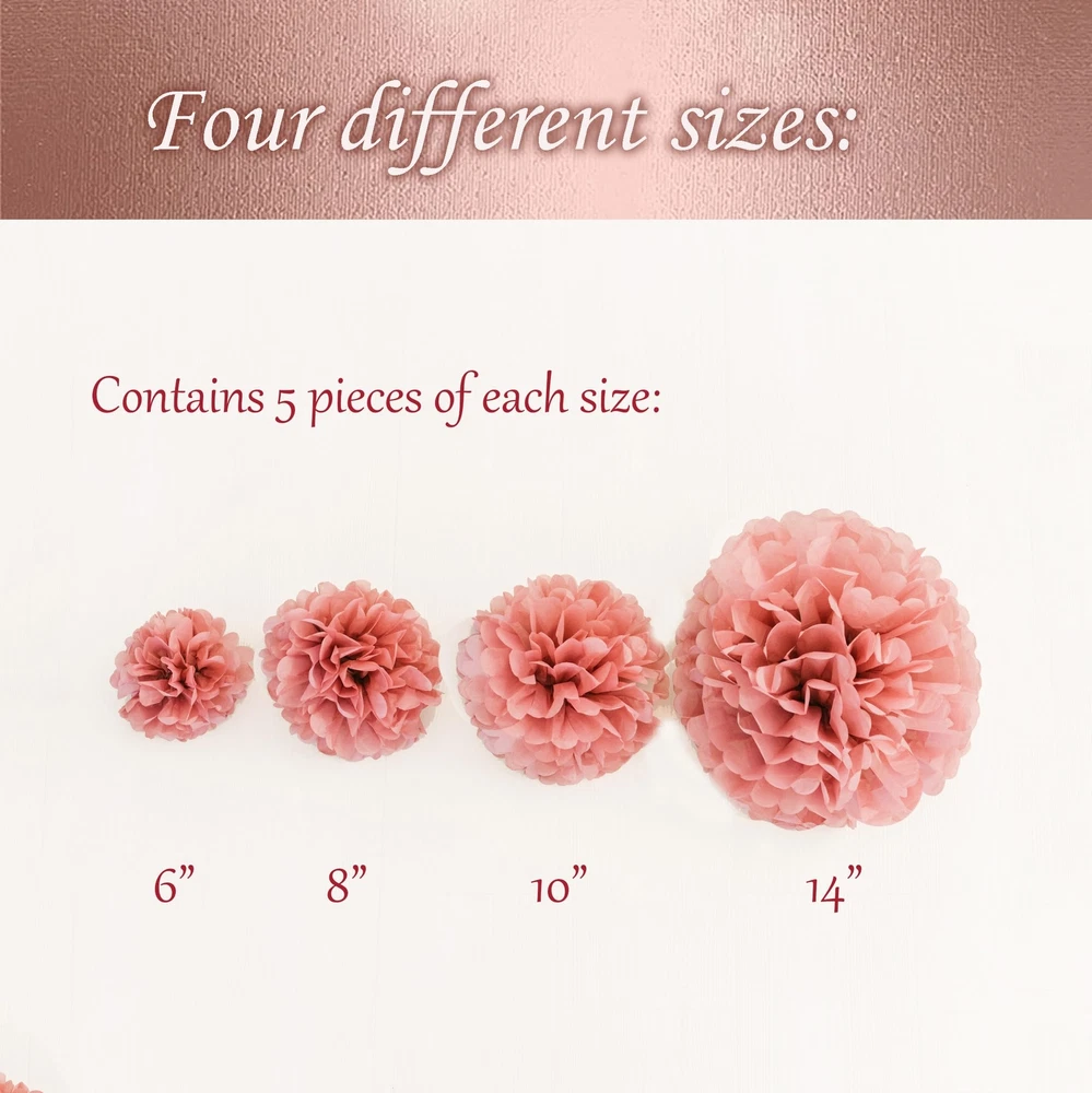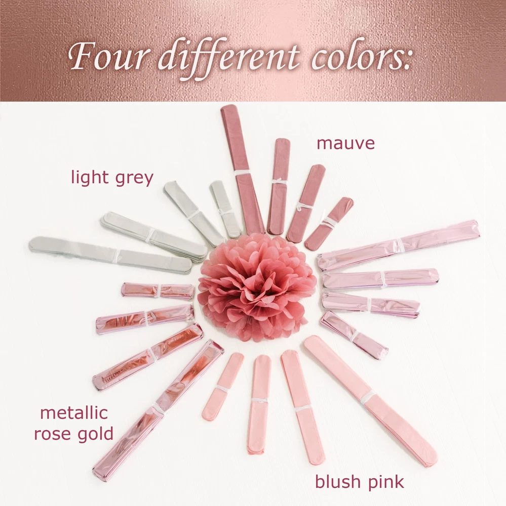 Tissue paper pom pom decorations are perfect for birthdays, engagements, weddings, bachelorette party, baby showers for girl, bridal showers or garden party. If you are going to celebrate a special event, you just found the perfect party decoration to create an elegant, festive atmosphere! Why choose us? We pay extra attention and strive to provide the best party pom poms in the market by using the highest quality materials available and by following the latest fall color trends We took time to extensively research popular color themes to provide you with the most exquisite color sequence for your event. With this party decoration kit, we bring you a stunning color combination by assorting shades like the lovely blush pink , the metallic, pink rose gold paired with soft neutral tones, such as grey, and of course the elegant dusty rose . These colors give an enchanting touch to the whole event! Go for glamour, romantic, vintage and modern all rolled into one As an extra touch, we use a generous amount of tissue paper sheets to ensure the pom poms are always fluffy and full What do you get? Our party supply kit contains a mixture of 20 assorted tissue paper pom poms which come in four different sizes (14", 10", 8", 6") and colors: 8 pcs of Pink Rose Gold pom poms 4 pcs of Blush Pink pom poms 4 pcs of Dusty Rose pom poms 4 pcs of Grey pom poms The Pom Poms will arrive folded, pre-cut and tied with a satin ribbon ready to hang! Are you ready to add Elegance and Beauty to your party? Buy NOW! TISSUE POM POMS DECORATION KIT (20 PIECES, 4 ASSORTED COLORS, 4 SIZES) - Contains 5 pieces of each size: 14”, 10”, 8” and 6” - each size comes in 4 different colors, being the perfect birthday party decoration, baby shower decoration, bridal shower decoration or wedding decoration AMAZING, CUSTOMIZED COLORS - Our tissue paper pom pom decorations come in BLUSH PINK, ROSE GOLD, GREY and DUSTY ROSE. Each color has been carefully dyed to meet the rose gold party decoration color trend, giving an elegant, unique touch to your event VERSATILE USAGE - The tissue paper flowers can be used for indoor and outdoor events, as photo backdrop, as room, table, or chair decoration, hung on ceilings, tents or trees PREMIUM QUALITY MATERIALS - We only use the most lush and generous amounts of high quality tissue paper to ensure that the final tissue flower pom poms will result in a perfect, round flower ball. They are easy to assemble, step-by-step instructions included SATISFACTION GUARANTEE - If for any reason you are not satisfied with the party pom poms decoration, please contact us so we can make it right for you