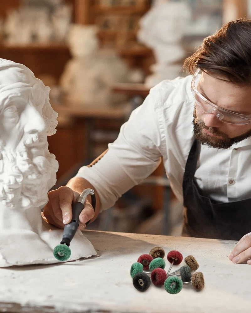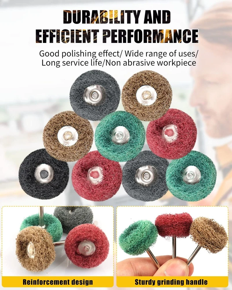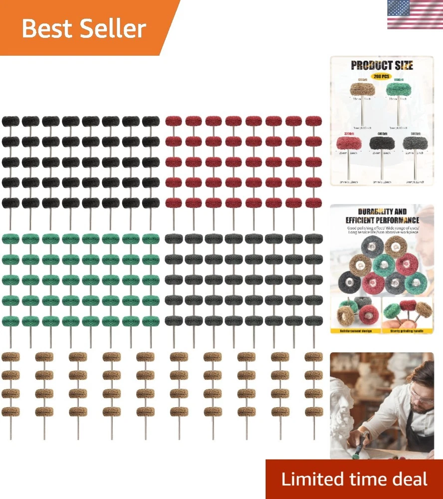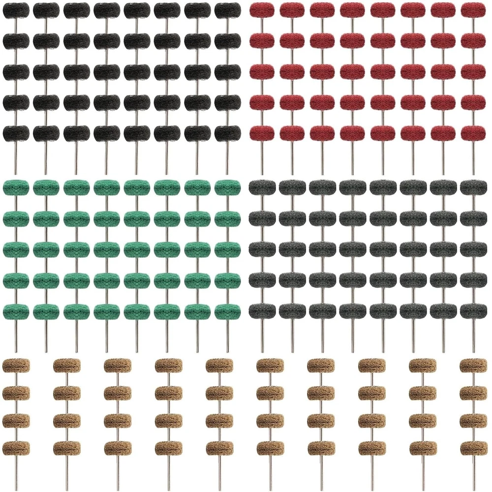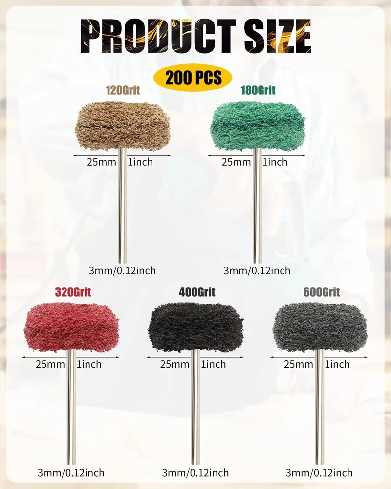 200 Pcs Abrasive Buffing Wheels, 1 inch Abrasive Buffing Polishing Wheels Burr for Rotary Tools-1/8"3mm Shank, 120Grit, 180Grit, 320Grit, 400Grit, 600Grit Achieve a smooth, uniform finish and conformability to irregular surfaces with minimal smearing using our Abrasive Buffing Wheel Set. Our set includes 50 pieces of 25mm abrasive wheels with 5 different grits (Brown 120Grit, Green 180Grit, Red 320Grit, Black 400Grit, Gray 600Grit), each with 10 pieces, making it perfect for all types of detail work in both hard and delicate materials. The shanks are 1/8 inch (3mm) and the buffing wheels are 1" in diameter, making them convenient and practical for efficient polishing of metal and non-metallic materials in small areas of rust deburring and surface polishing. Our buffing wheels are compatible with most rotary tools, making them a versatile and cost-effective polishing tool for metal surface cleaning, grinding, dusting, deburring, polishing, stripping residue, and removing oxide. These polish wheels are also great for polishing jewelry or other metal working uses, and can be used with a tool, fit for rotary tools grinder etc. They are perfect accessories for fine detail work on jade, ceramic, glass, wood, hardened steel, cast iron, stainless steel, and more.