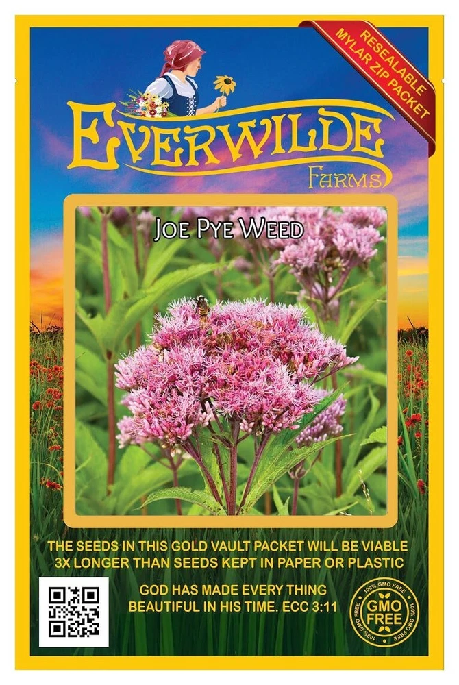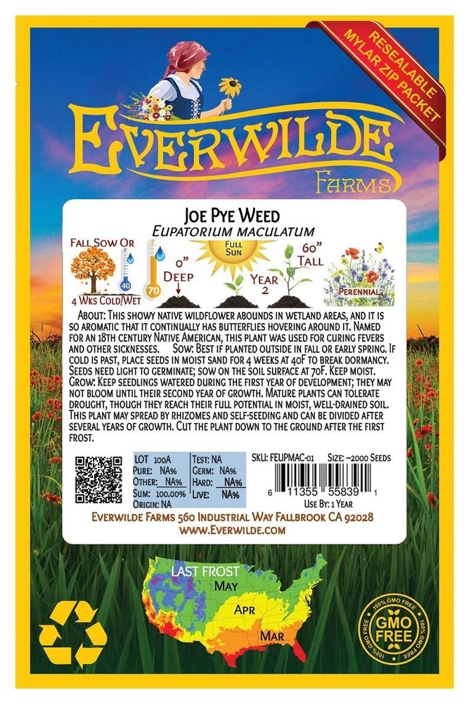 XL Mylar Packet - Joe Pye Weed Seeds Gold Vault Mylar Zip Packet According to legend, an 18th century healer named Joe Pye often used this plant for curing fevers and other sickness. Early settlers used this plant in the treatment of typhus, while Native Americans used it to cause the body to sweat. The genus name "Eupatorium" comes from a connection to an ancient Greek king named Eupator, who was rumored to have found an herbal antidote to poison that included this species. Though it has become increasingly rare in the wild, it can still be found occasionally in moist areas such as swamps and riverbanks. Direct sow in late fall, pressing the seeds into the surface of the soil since they need light to germinate. For spring planting, mix the seeds with moist sand and store in the refrigerator for 60 days before direct sowing. To start indoors, scatter the seed on the surface of the soil in a flat; compress the soil slightly and keep it lightly moist until germination, which is naturally slow but should take place within 2-3 months. Keep the soil consistently moist, and transplant seedlings as soon as they reach a height of several inches. These seeds are non-GMO (Genetically Modified Organisms), and are also free from all Neonicotinoids . They are packaged in our superb Gold Mylar Mylar Zip Packaging, which gives the seeds the best storage possible, and allows you to reseal the bag for later use. The artwork and labels on the packet are loaded with information - many people comment that it is the most beautiful packet that they have ever seen. If you have never tried out our seeds before, this is your chance to experience something special!