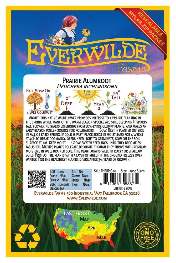 XL Mylar Packet - Prairie Alumroot Seeds Gold Vault Mylar Zip Packet Historically, the root of this native plant was used as a substitute for alum, a powder used to preserve crispness in the pickling process. Modern hybrids of this plant family are often known as Coral Bells, grown mainly for their ornamental foliage. Carl Linnaeus named the genus "Heuchera" in honor of the influential German botanist and physician Johann Heinrich von Heucher (1677-1747) of Wittenberg University. The species name "richardsonii" commemorates 19th century naturalist and explorer Sir John Richardson, who published many accounts of historical arctic expeditions. Direct sow in late fall, pressing the tiny seeds in the surface of rich soil and sprinkling a very thin layer of soil on top; this seed needs light to germinate. For spring planting, mix the seed with a small amount of sand and store it in the refrigerator for 30 days before direct sowing. Keep the soil moist until germination. To start indoors, plant the seed on the surface of the soil in a flat; keep it lightly moist and at a temperature of 70 degrees F until germination. Transplant seedlings outdoors as soon as they can safely be handled. These seeds are non-GMO (Genetically Modified Organisms), and are also free from all Neonicotinoids . They are packaged in our superb Gold Mylar Mylar Zip Packaging, which gives the seeds the best storage possible, and allows you to reseal the bag for later use. The artwork and labels on the packet are loaded with information - many people comment that it is the most beautiful packet that they have ever seen. If you have never tried out our seeds before, this is your chance to experience something special!