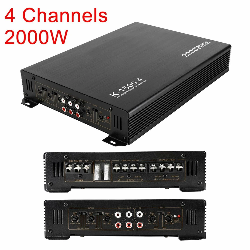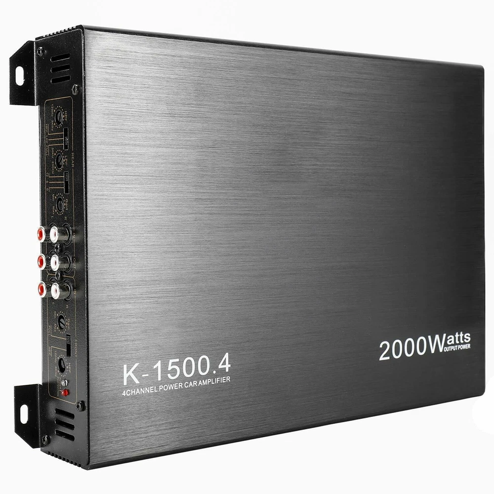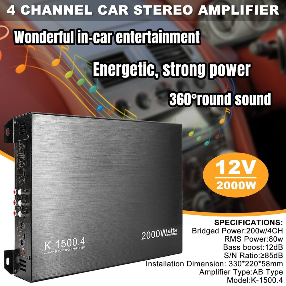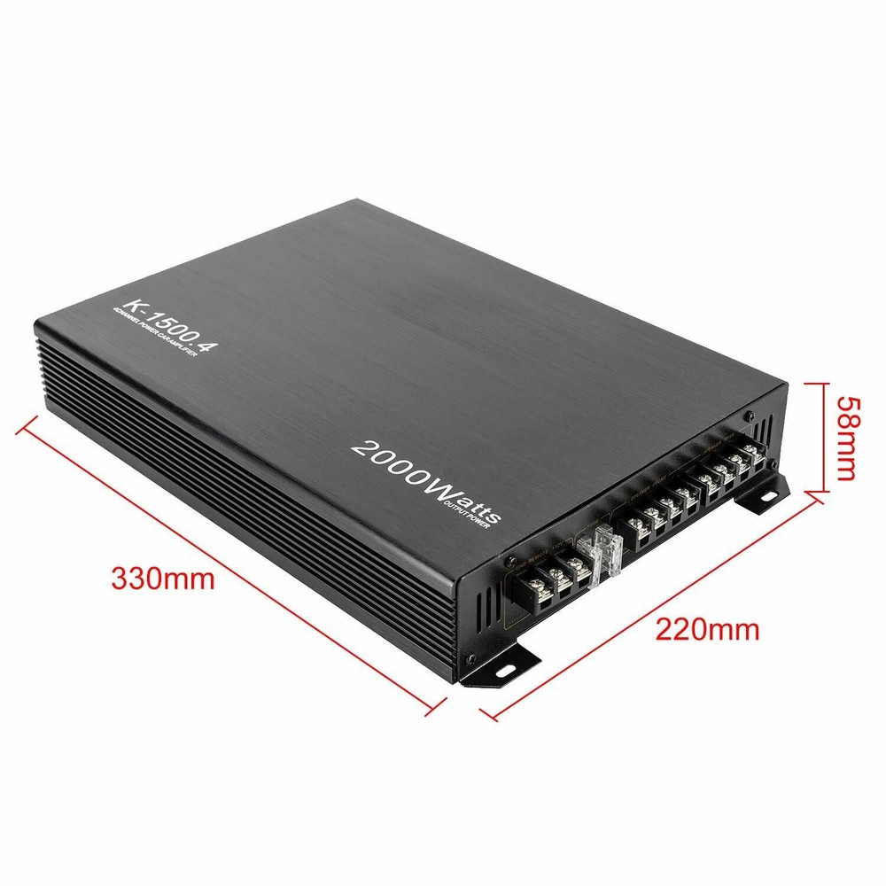 Fit Your Choice,Fit Your Budget Installation Dimension: 330*220*58mm Amplifier Type: AB Type Model: K-1500.4 Package included: 1 x 12V Car Amplifier 1 x English User Manual 4 x Screws set YaeCCC 2000W 4 Channel Amplifier Car Audio Car Amplifiers Adopts professional design, high power ULTRA THIN DESIGN : 2000W 4 Channel car power amplifier features a slim design and is easy to install, providing you with wonderful in car entertainment. 4 way protection circuit-thermal ,current,D.C. Moffset,and over-voltage,soft start delayed turn-on,Stereo/mono setup simultaneously Bridged Power: 200w/4CH RMS Power: 80w Maximum Power: 2000w Frequency Response: 10Hz~40KHz±1dB Bass boost: 12dB S/N Ratio:≥ 85dB Speaker Impedance: 2~16Ω THD: ≤0.1% Input Sensitivity: 200mv Amplifier Class: Class A/B Class-A/B amplifiers feature specific linear circuitry Increases sound quality and power output while reducing distortion Aluminium Alloy Casting Drawing Process Advamced Material and Slim design With a reasonable plate planning, generous materials and solid workmanship. 12V 4 Channel Car Audio Power Amplifier Wonderful in-car entertainment 360°round sound Energetic, strong power