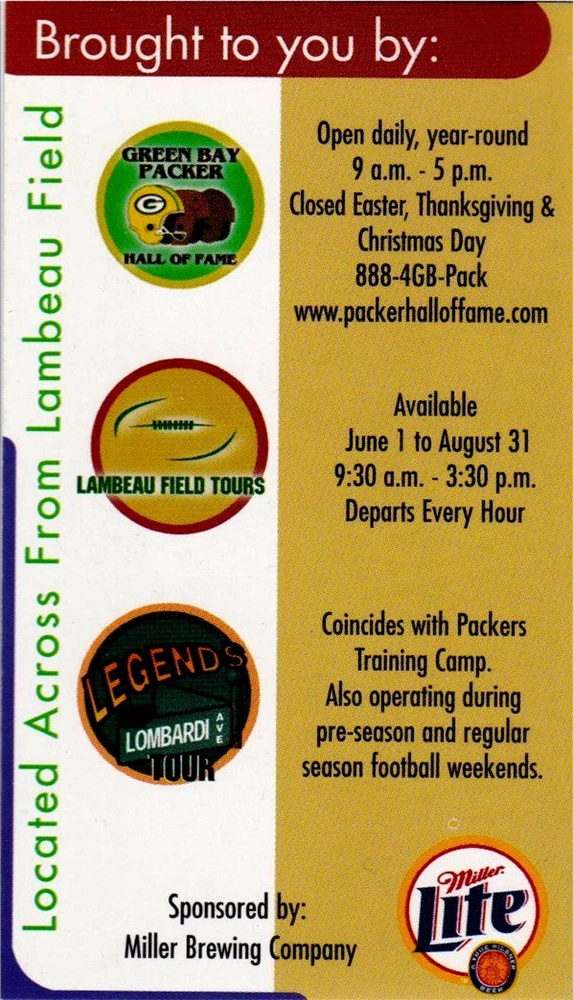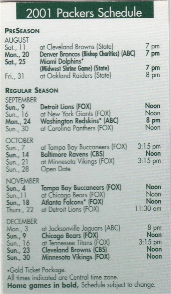 2001 Green Bay Packers NFL Football Pocket Schedule- Miller Beer - See picture for condition. I’m a collector just trying to clear out space. All Items are used unless stated otherwise. I try and list any major flaws I see. Please check out my other lots. Shipping discounts on multiple auctions won!! Please email at close of auction for combined shipping. Ebay will not automaticly combine postage. We only ship to the US. Please pay or contact us within 7 days of closing or we have to report it as a nonpay to ebay. Check out my other auctions on Ebay. Thanks for looking!! Our items do NOT come from a smoke-free environment. Please be aware of this before you place a bid. We get our items from many different sources and they have probably been exposed to smoke - cigarette, cigar, pipe or other - or pets, so if these issues are likely to bother you, please reconsider bidding. I make every effort to accurately and honestly describe each item. Most items are vintage/pre-owned and are sold as such. The flaws I see are listed. Our items are sent to you clean but odors may still linger. My goal is that you, as a buyer, are happy with your purchase