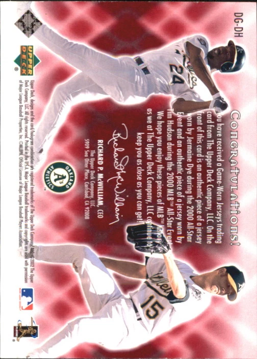 2002 (ATHLETICS) UD Double Game Worn Gems #DGDH J.Dye/T.Hudson Front Back Sport: Baseball Set: 2002 Upper Deck Double Game Worn Gems Year: 2002 Item#: DGDH Player: Jermaine Dye, Tim Hudson Team: Oakland Athletics Attributes: Memorabilia, Serial Numbered Brand: Upper Deck Manufacturer: Upper Deck Co. Grading Company: Raw Grade SetType: Insert Item Condition: Near Mint/Mint 2014 Beckett Collectibles, LLC. All Rights Reserved Powered by: Thank you for choosing Burbank Sportscards, the sports cards superstore. We offer a large selection of singles across all sports. Visit our ebay store to view all our items available. Our Shipping Policy We offer Free Standard Shipping to all Domestic customers. Options for Expedited shipping are also available at checkout. For our international customers, shipping is $9.99 for the first item, and $0.25 for each additional item. Note to all customers: To qualify for combines shipping, we ask our customers to add items into the shopping cart. Please note, we do not combine orders that are placed separately. Our Service: Generally, our turnaround is super quick as we process and send out orders same day payment is received. Stock Availability: We do our best to ensure all items are in stock; however, in case of the rare stock out, the customer will have the option for a replacement card, or we will process a refund so the order is not held up. Our Images: Many of our images are stock photos from Beckett archives. They are a representation of the actual card you would receive. If you have any questions regarding the item you're interested in, please feel free to ask (serial numbers and relic pieces may vary) Moreover, in a case of a wrong or defective photo, please notify us, so we can adjust it. Other FAQ's: -When buying multiple cards, do you top load each item? No; however, we do try to insure all items are shipped securely. If you wish to have all of your cards top loaded it is a paid service and can be arranged. Please email for more details. For other questions, please feel free to ask. Thank you.