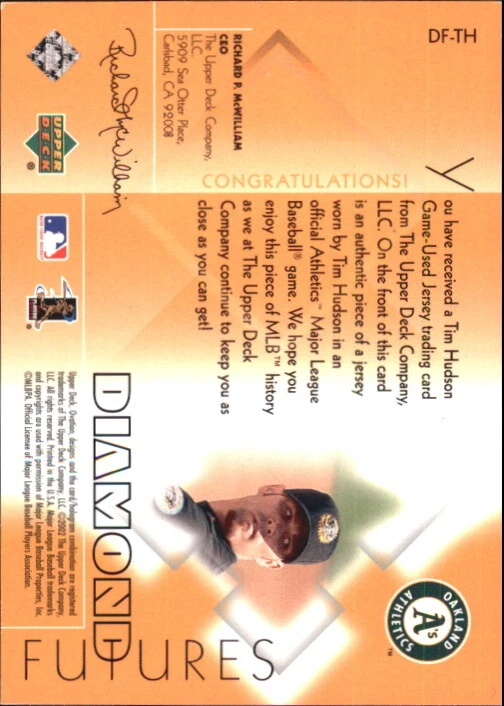 2002 (ATHLETICS) Upper Deck Ovation Diamond Futures Jerseys #DFTH Tim Hudson Front Back Sport: Baseball Set: 2002 Upper Deck Ovation Diamond Futures Jerseys Year: 2002 Item#: DFTH Player: Tim Hudson Team: Oakland Athletics Attributes: Memorabilia Brand: Upper Deck Ovation Manufacturer: Upper Deck Co. Grading Company: Raw Grade SetType: Insert Item Condition: Near Mint/Mint 2014 Beckett Collectibles, LLC. All Rights Reserved Powered by: Thank you for choosing Burbank Sportscards, the sports cards superstore. We offer a large selection of singles across all sports. Visit our ebay store to view all our items available. Our Shipping Policy We offer Free Standard Shipping to all Domestic customers. Options for Expedited shipping are also available at checkout. For our international customers, shipping is $9.99 for the first item, and $0.25 for each additional item. Note to all customers: To qualify for combines shipping, we ask our customers to add items into the shopping cart. Please note, we do not combine orders that are placed separately. Our Service: Generally, our turnaround is super quick as we process and send out orders same day payment is received. Stock Availability: We do our best to ensure all items are in stock; however, in case of the rare stock out, the customer will have the option for a replacement card, or we will process a refund so the order is not held up. Our Images: Many of our images are stock photos from Beckett archives. They are a representation of the actual card you would receive. If you have any questions regarding the item you're interested in, please feel free to ask (serial numbers and relic pieces may vary) Moreover, in a case of a wrong or defective photo, please notify us, so we can adjust it. Other FAQ's: -When buying multiple cards, do you top load each item? No; however, we do try to insure all items are shipped securely. If you wish to have all of your cards top loaded it is a paid service and can be arranged. Please email for more details. For other questions, please feel free to ask. Thank you.