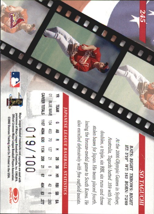 This is a fantastic find for any Cardinals collector! The 2002 Studio Proofs So Taguchi card is a rare gem, serial numbered /100, with sharp design and crisp details. The near mint/mint condition makes it a must-have for fans of Taguchi or vintage baseball memorabilia. A great addition to any serious collection!
