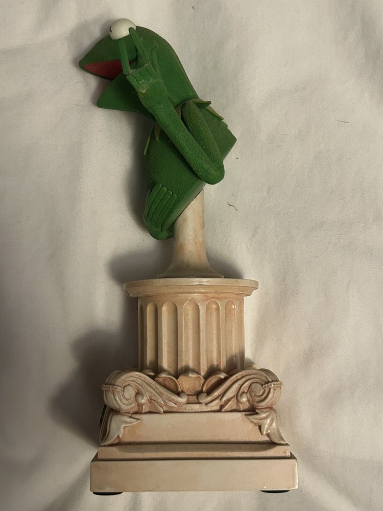 The product is a 2002 Sideshow Kermit the Frog statue that is signed and numbered by the manufacturer. This collectible figurine features the beloved character Kermit the Frog, known for his iconic appearance and charm in the world of comics and memorabilia. The statue is a must-have for fans and collectors of Kermit the Frog memorabilia, adding a unique and special touch with its limited edition status and missing fingers detail. The statue is missing the 2 middle fingers on the left hand and is numbered 574/5000 and signed by the sculpture Ben Hawker. Great addition to any collection!!