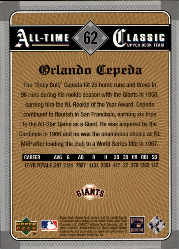2002 Sweet Spot Classics #62 Orlando Cepeda Front Back Sport: Baseball Set: 2002 Sweet Spot Classics Year: 2002 Item#: 62 Player: Orlando Cepeda Team: San Francisco Giants Brand: Sweet Spot Classics Manufacturer: Upper Deck Co. Grading Company: Raw Grade SetType: Main Item Condition: Near Mint/Mint 2014 Beckett Collectibles, LLC. All Rights Reserved Powered by: Thank you for choosing Burbank Sportscards, the sports cards superstore. We offer a large selection of singles across all sports. Visit our ebay store to view all our items available. Our Shipping Policy We offer Free Standard Shipping to all Domestic customers. Options for Expedited shipping are also available at checkout. For our international customers, shipping is $9.99 for the first item, and $0.25 for each additional item. Note to all customers: To qualify for combines shipping, we ask our customers to add items into the shopping cart. Please note, we do not combine orders that are placed separately. Our Service: Generally, our turnaround is super quick as we process and send out orders same day payment is received. Stock Availability: We do our best to ensure all items are in stock; however, in case of the rare stock out, the customer will have the option for a replacement card, or we will process a refund so the order is not held up. Our Images: Many of our images are stock photos from Beckett archives. They are a representation of the actual card you would receive. If you have any questions regarding the item you're interested in, please feel free to ask (serial numbers and relic pieces may vary) Moreover, in a case of a wrong or defective photo, please notify us, so we can adjust it. Other FAQ's: -When buying multiple cards, do you top load each item? No; however, we do try to insure all items are shipped securely. If you wish to have all of your cards top loaded it is a paid service and can be arranged. Please email for more details. For other questions, please feel free to ask. Thank you.