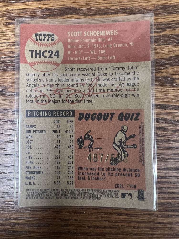 This is a great find for collectors! The 2002 Topps Heritage Chrome Schoeneweis is a sharp-looking card with a limited print run of 553. The seller offers fair shipping rates, including free extras for multi-card orders. A solid addition to any vintage baseball card collection—definitely worth checking out!