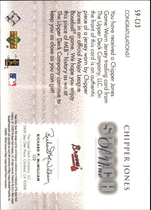 2002 UD Honor Roll Stitch of Nine Game Jsy Braves Baseball Card #S9CJ3 C.Jones Front Back Sport: Baseball Set: 2002 Upper Deck Honor Roll Stitch of Nine Game Jersey Year: 2002 Item#: S9CJ3 Player: Chipper Jones Team: Atlanta Braves Attributes: Memorabilia Brand: Upper Deck Honor Roll Manufacturer: Upper Deck Co. Grading Company: Raw Grade SetType: Insert Item Condition: Near Mint/Mint 2014 Beckett Collectibles, LLC. All Rights Reserved Powered by: Thank you for choosing Burbank Sportscards, the sports cards superstore. We offer a large selection of singles across all sports. Visit our ebay store to view all our items available. Our Shipping Policy We offer Free Standard Shipping to all Domestic customers. Options for Expedited shipping are also available at checkout. For our international customers, shipping is $9.99 for the first item, and $0.25 for each additional item. Note to all customers: To qualify for combines shipping, we ask our customers to add items into the shopping cart. Please note, we do not combine orders that are placed separately. Our Service: Generally, our turnaround is super quick as we process and send out orders same day payment is received. Stock Availability: We do our best to ensure all items are in stock; however, in case of the rare stock out, the customer will have the option for a replacement card, or we will process a refund so the order is not held up. Our Images: Many of our images are stock photos from Beckett archives. They are a representation of the actual card you would receive. If you have any questions regarding the item you're interested in, please feel free to ask (serial numbers and relic pieces may vary) Moreover, in a case of a wrong or defective photo, please notify us, so we can adjust it. Other FAQ's: -When buying multiple cards, do you top load each item? No; however, we do try to insure all items are shipped securely. If you wish to have all of your cards top loaded it is a paid service and can be arranged. Please email for more details. For other questions, please feel free to ask. Thank you.